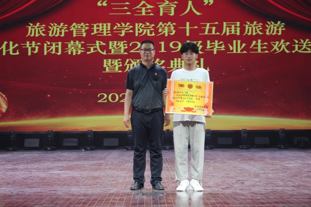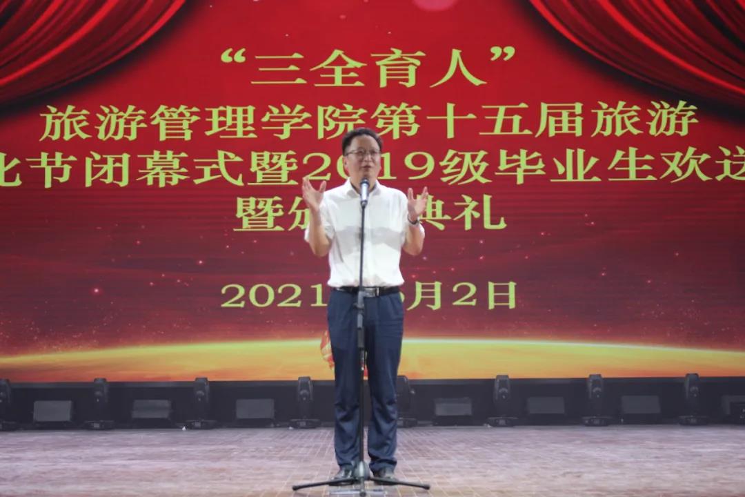 王振超为闭幕式致辞,他代表学校祝贺本届旅游文化节取得圆满成功!同时向组织本届旅游文化节的师生表示衷心的感谢!他指出,十五年的积淀与传承,坚守与创新,担当与奉献,为旅游管理学院锻造了灿若星辰的文化名片,为同学们提供了丰富的精神食粮,是全面践行文化育人、实践育人的重要平台,是校园文化的一道亮丽的风景线,一张响亮的名片。文化节期间举办了专家讲座、班级文明礼仪风采大赛、“乐途杯”旅游知识竞赛等系列活动,深挖德育元素,强化实践培育,把思政教育融于学生日常学习生活中,把社会主义核心价值观融于学生的血脉和灵魂,转化为学生的情感认同、行为习惯和价值取向,实现思政教育与专业教育协同发展。他真诚的希望同学们在今后的学习、工作、生活中,不断感悟经典、传承文化、陶冶情操、塑造灵魂,让正直风度、儒雅气度、艺术修养伴随一生,勇于面对生活中的各种挑战,既做追梦者,又做圆梦人,将实现自我价值和时代发展结合起来,扎扎实实谋事,老老实实做人,将个人的理想与中华民族伟大复兴的中国梦有机结合起来,在新的征途中飞得更高,飞的更远。