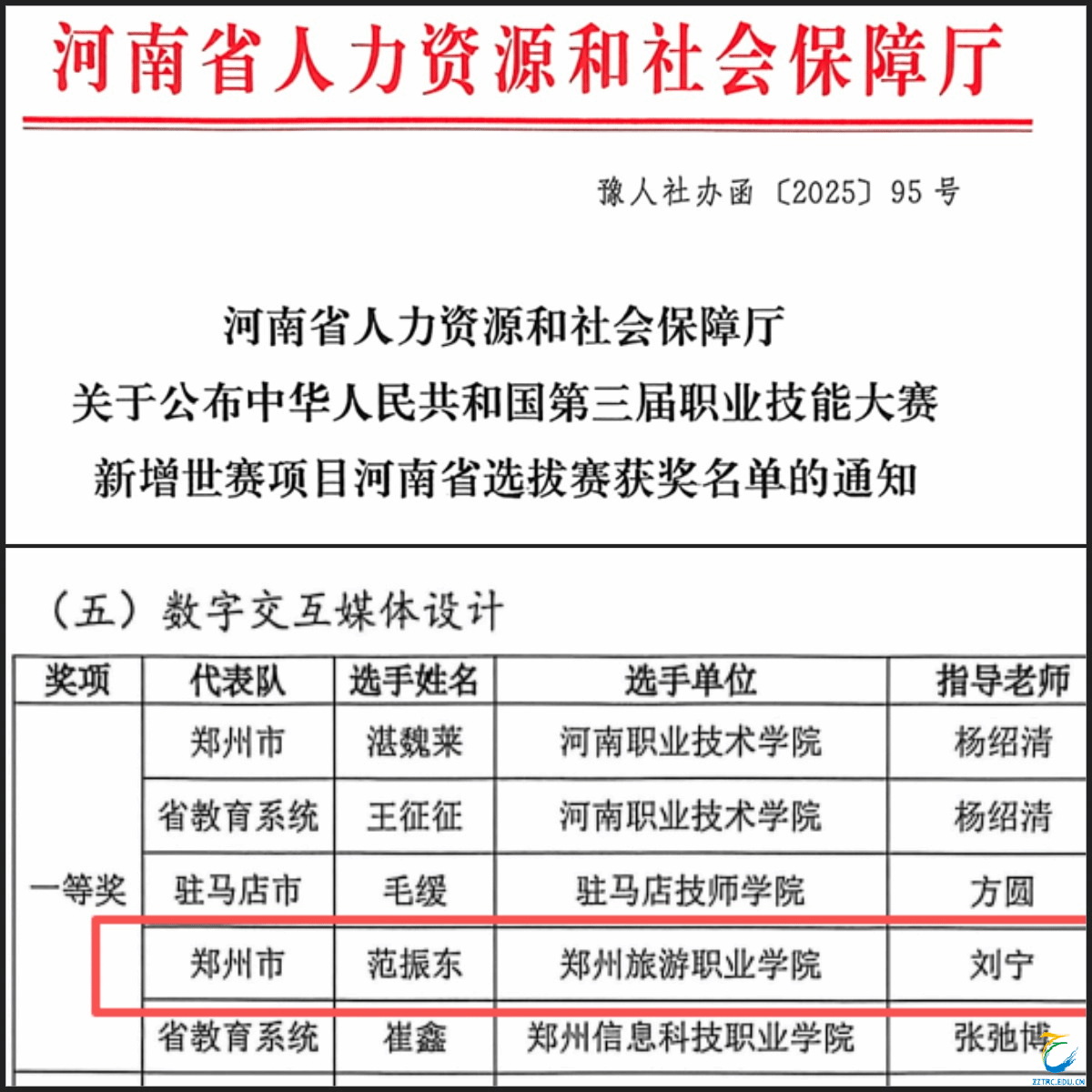 12月10日,《河南省人力资源和社会保障厅关于公布中华人民共和国第三届职业技能大赛相关情况的通知》正式下发,pp电子数字文创学院范振东凭借过硬实力,在数字交互媒体设计项目中获得一等奖。