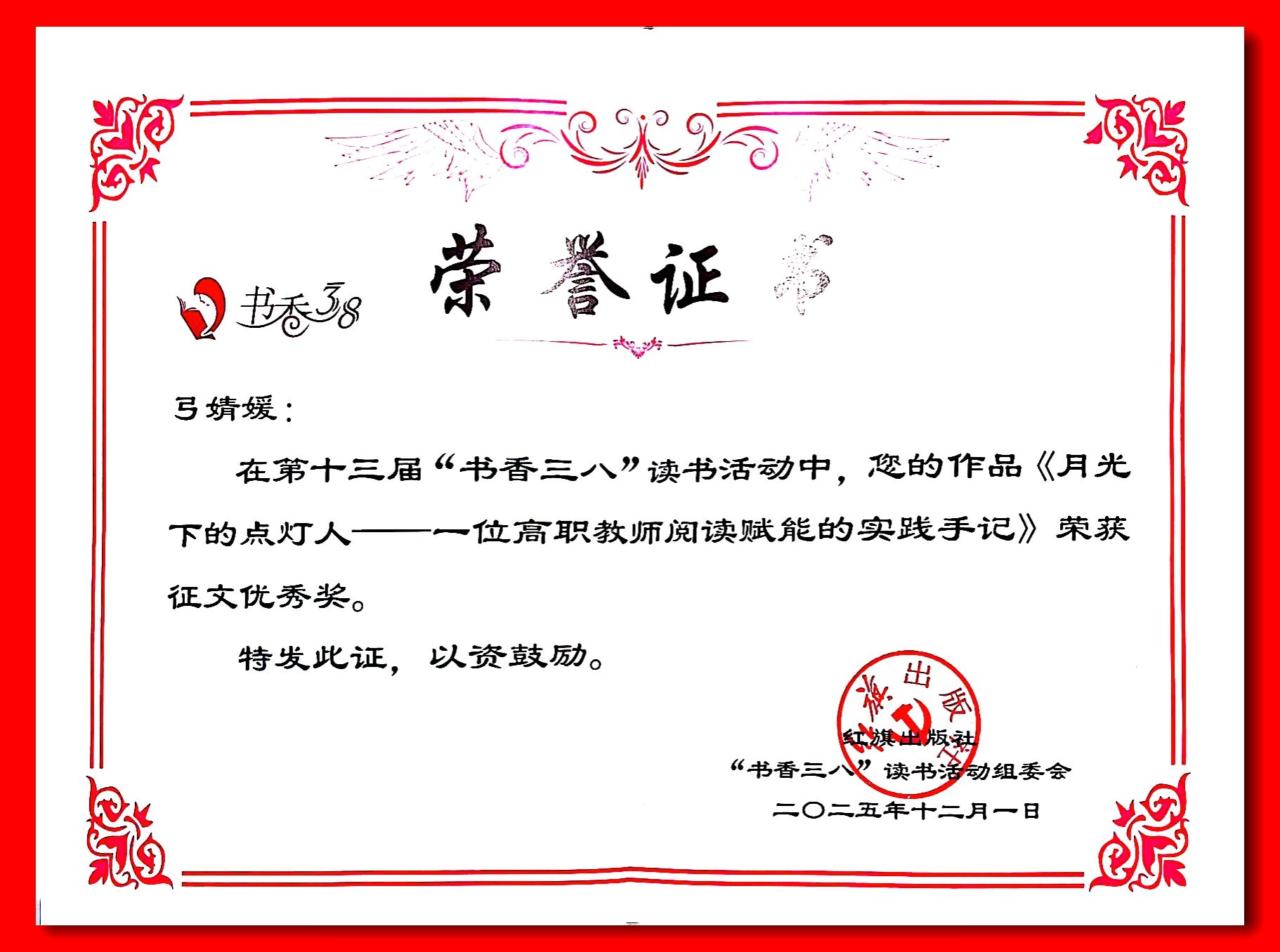 近日,第十三届“书香三八”读书活动获奖名单正式揭晓。pp电子人文科技学院教师弓婧媛的征文作品《月光下的点灯人——一位高职教师阅读赋能的实践手记》,从全国十万余件参赛作品中脱颖而出,荣获征文类作品优秀奖。