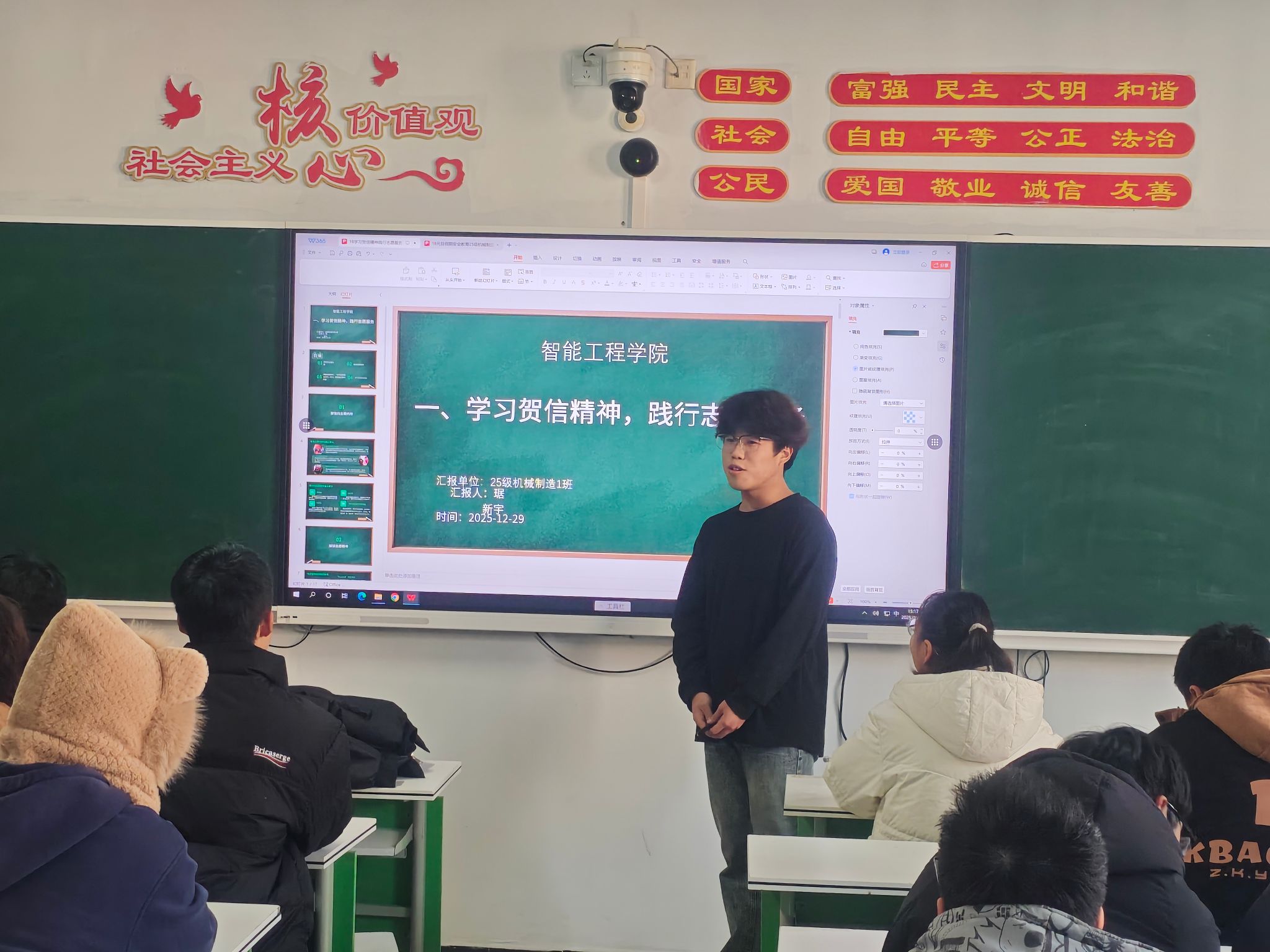 为深入学习贯彻贺信精神,引导青年学子厚植家国情怀,主动践行志愿服务精神,12月29日,智能工程学院组织各班级开展“学习贺信精神,践行志愿服务”主题班会,本次班会由各班团支书主持。