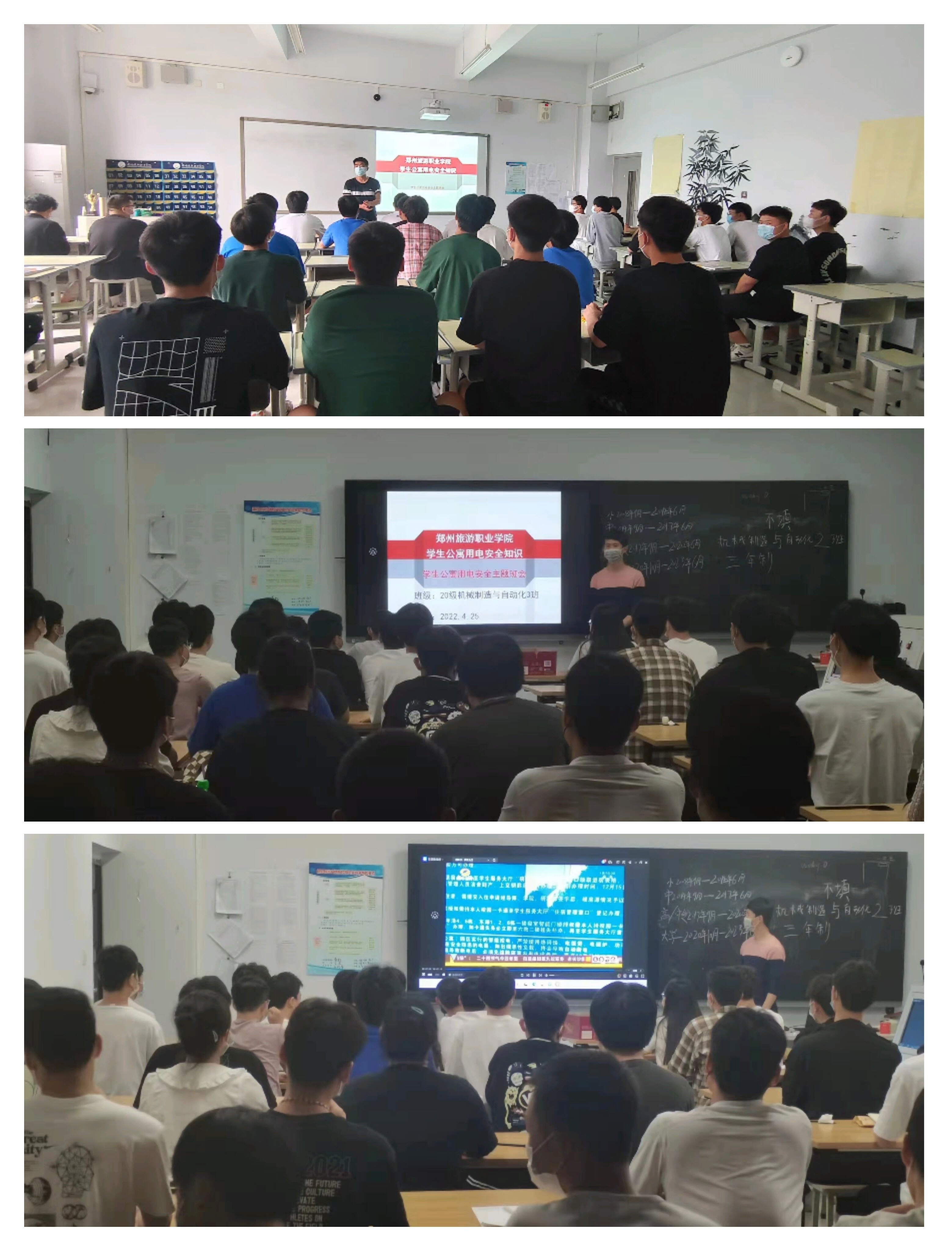 为进一步加强学生自我安全意识,提高自我管理能力,全面普及安全教育知识,4月25-26日,机电工程学院全体在校班级组织开展安全教育主题班会。