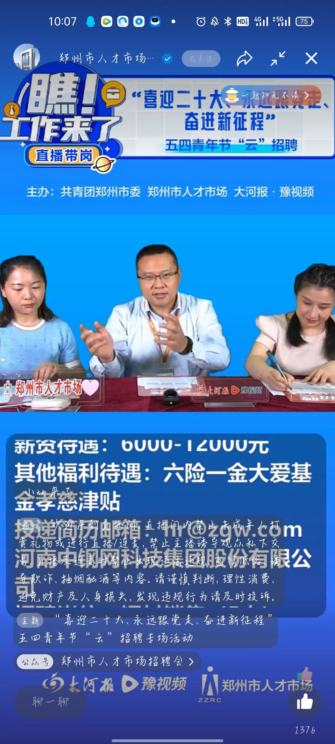 为进一步促进我院学生就业,由共青团郑州市委、郑州市人才市场主办的“喜迎二十大、永远跟党走、奋进新征程” 五四青年节“云”招聘直播带岗活动,于4月26号上午9:30正式开始,中午12:30左右结束。
