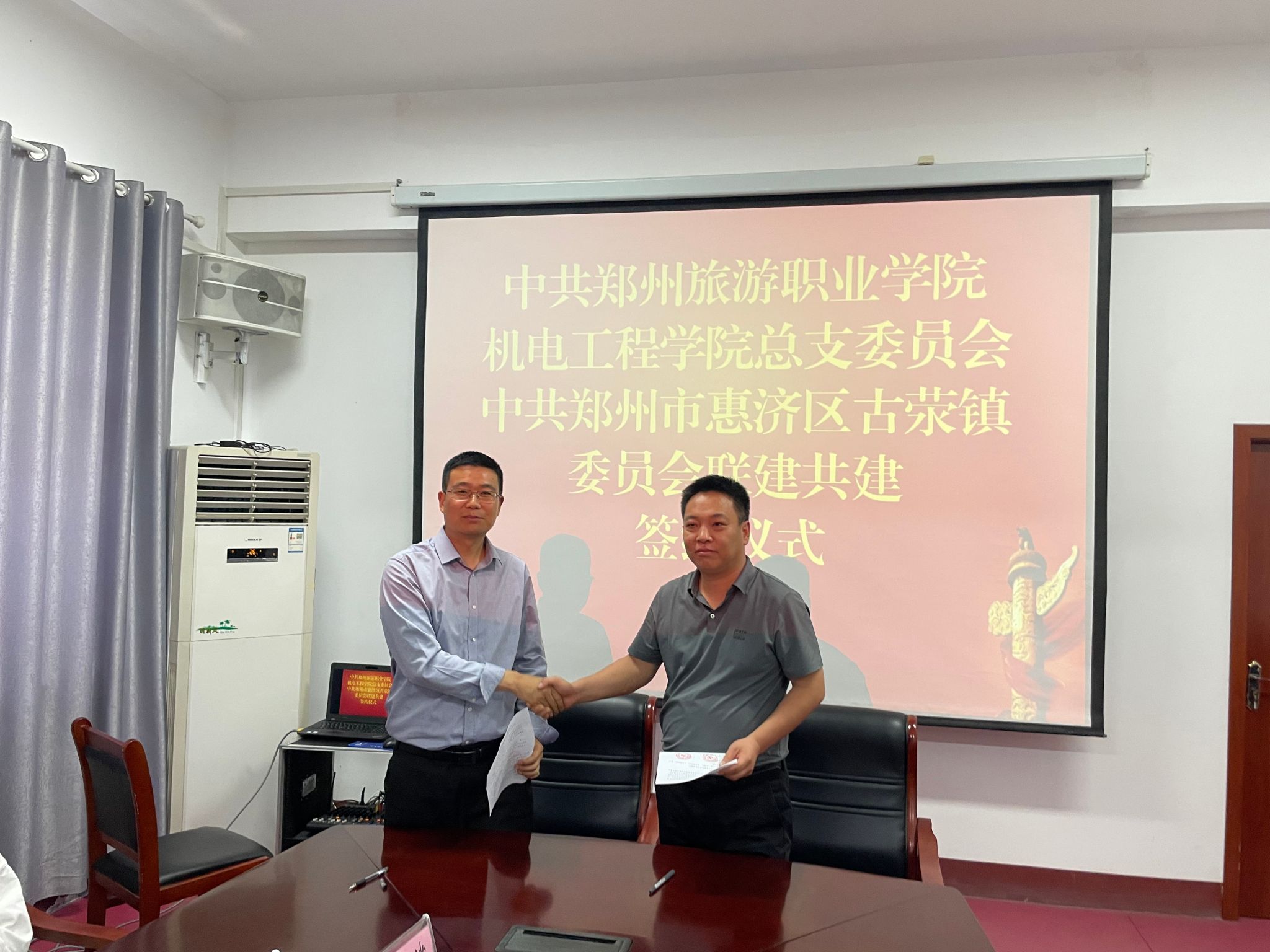 6月27日,机电工程学院党总支与郑州市惠济区古荥镇党委共同举行了党建联建活动,双方共同签署了联建共建协议书。党总支书记张培彦、院长张之红和党员代表参加此次活动。