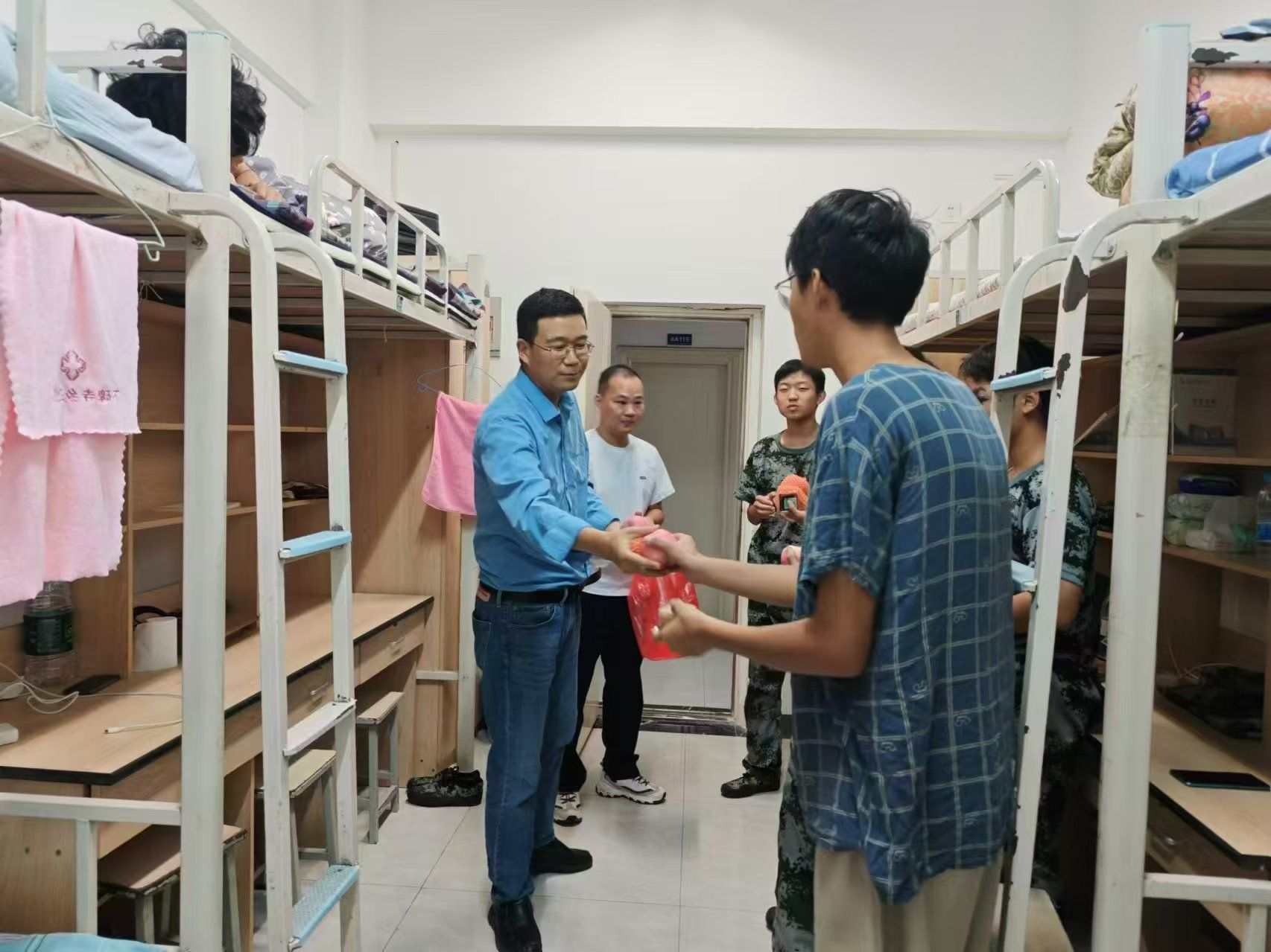 军姿飒爽,青春飞扬。为深入了解2024级学生军训情况,鼓舞军训士气,同时在中秋佳节来临之际为新老学生送上温暖关怀。9月17日,机电工程学院党总支书记张培彦、院长张之红带领值班教师、各班辅导员老师一同慰问2024级军训参训学生,并在此次慰问活动中,学院领导还深入学生宿舍,为新老学生发放了月饼和苹果等中秋慰问品。
