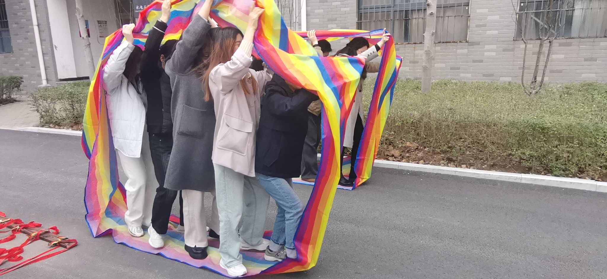 在"旱地龙舟"项目中,每队6名教师需脚踩龙舟道具,通过同步抬腿移动完成30米竞速。飞虎队凭借整齐划一的口号率先抵达终点,而在"车轮滚滚"环节,参赛队伍要用特制布质履带搭建移动通道,追风队以"前导后推"的创新战术实现速度突破,赢得阵阵喝彩。