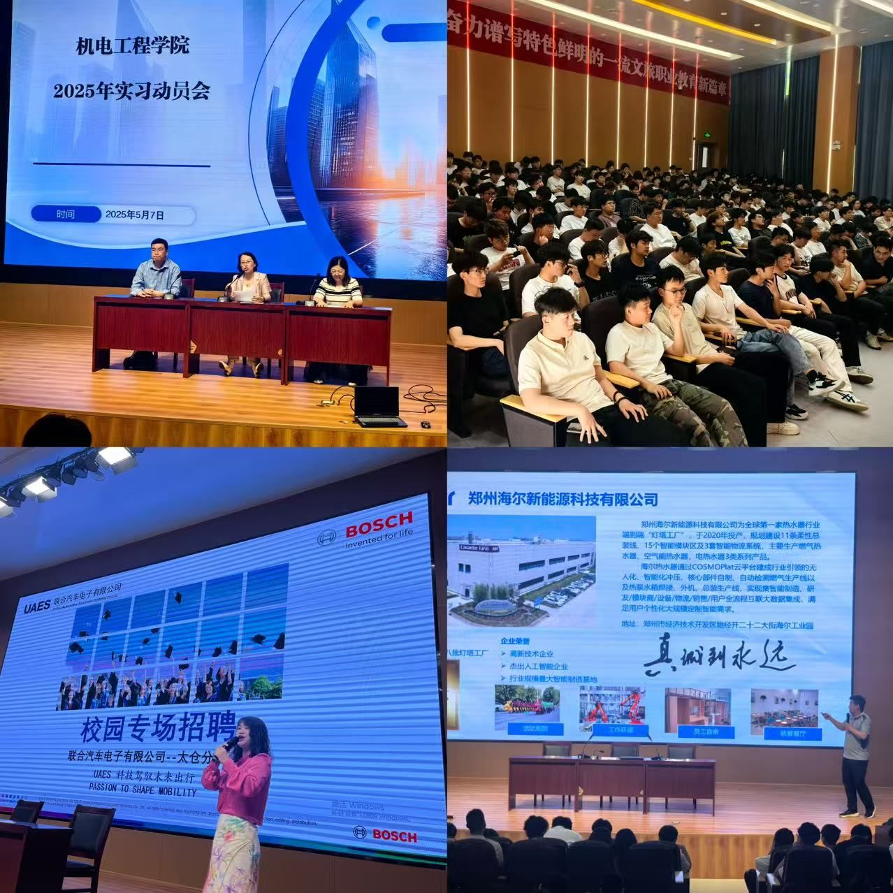2025年5月7日下午,机电工程学院在2号楼报告厅举行实习动员大会。会议由实习就业干事侯冬梅主持,23级三年制、21级五年制全体学生参会,学院领导及企业代表共同出席。