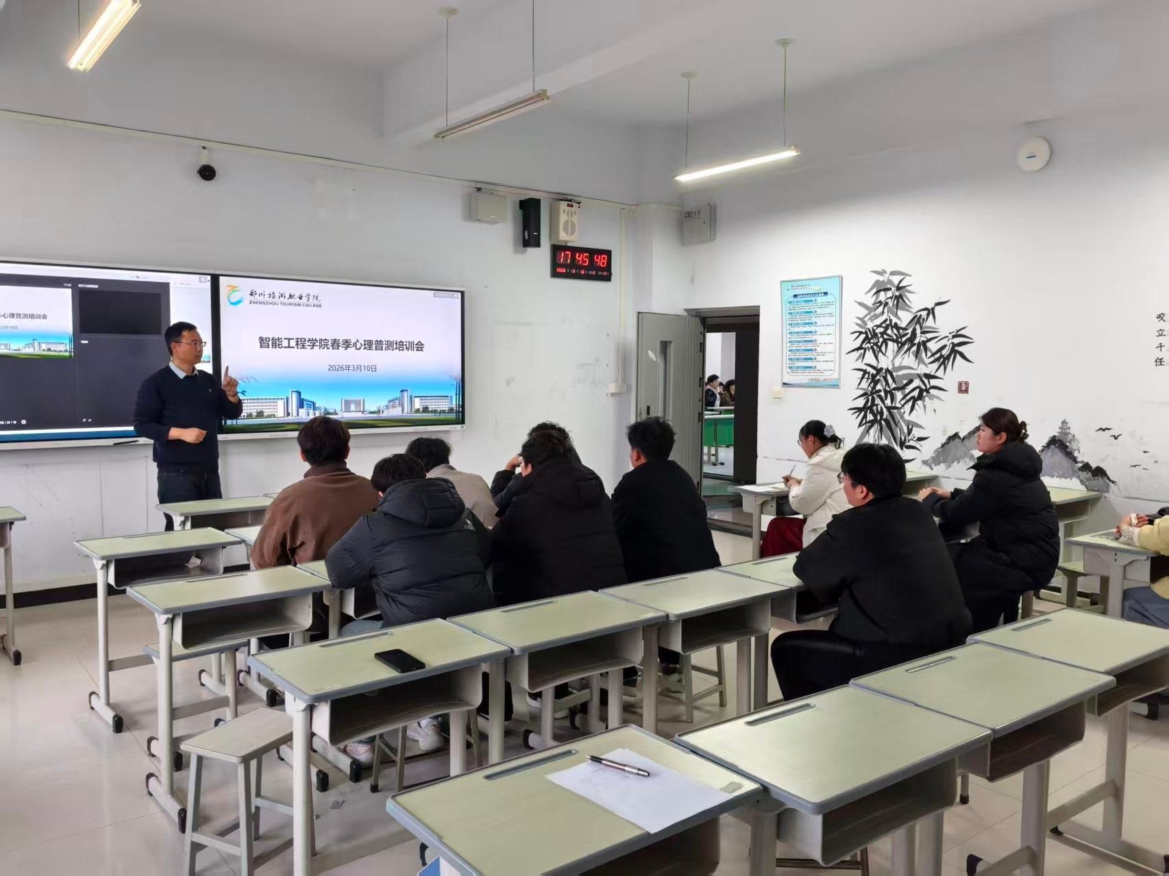 为扎实做好春季学生心理健康教育工作,精准掌握学生心理状态,筑牢校园心理安全防线,3 月 10 日,智能工程学院召开 2026 年春季心理健康普测培训会。学院心理健康负责老师马彦锋主讲,各班心理委员、心教部成员参会。