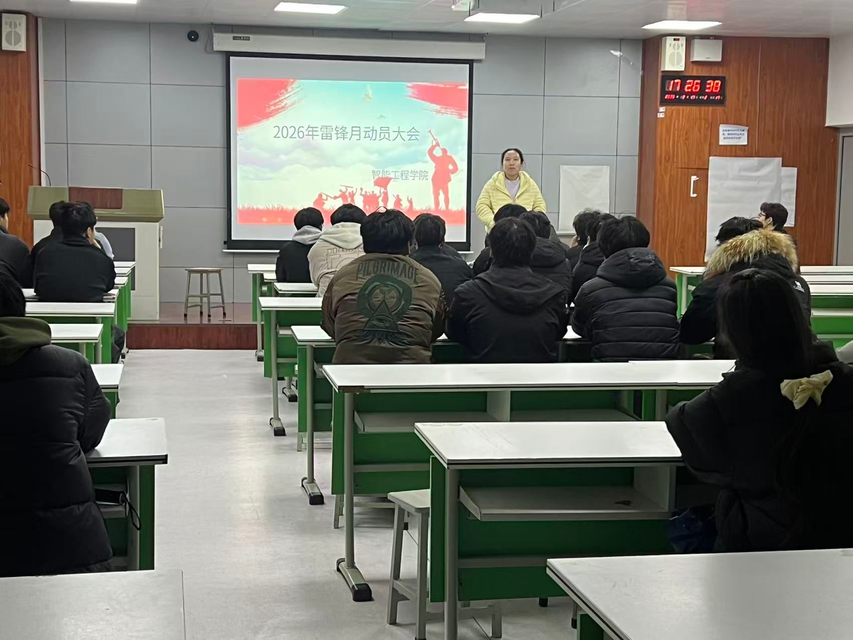 为深入学习贯彻雷锋精神,弘扬“奉献、友爱、互助、进步”的志愿精神,进一步引导青年学子厚植奉献情怀、强化责任担当,近日,智能工程学院组织召开2026年雷锋月活动动员大会。学院团总支书记张冰主持会议,全体团支书参加本次动员大会。