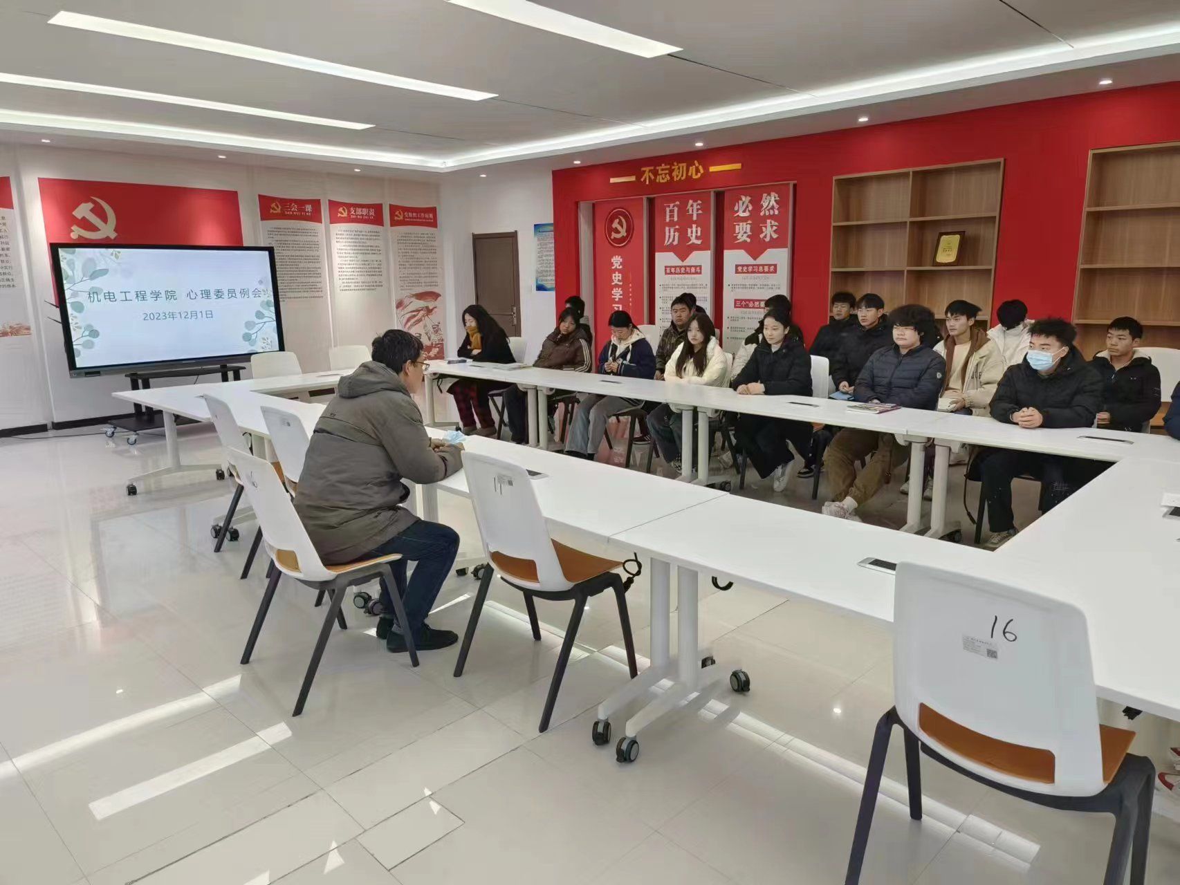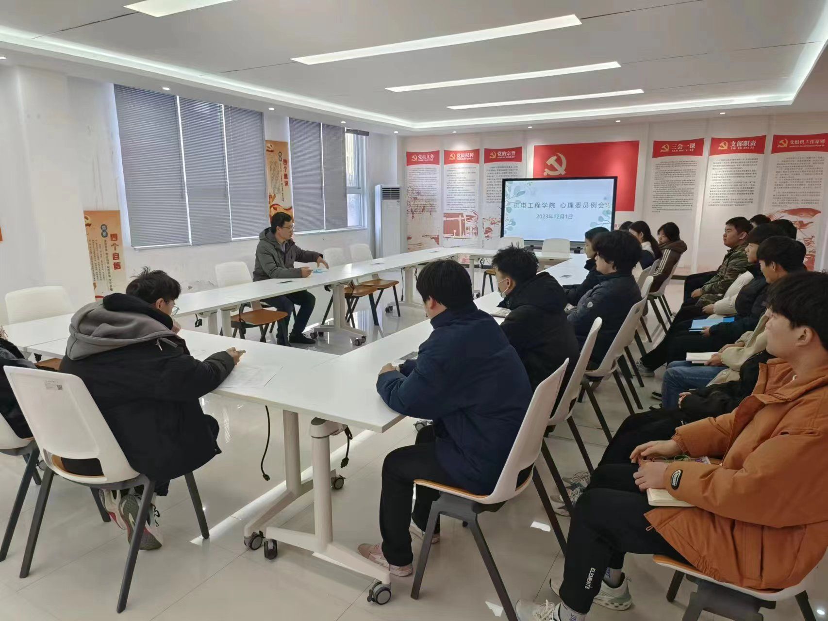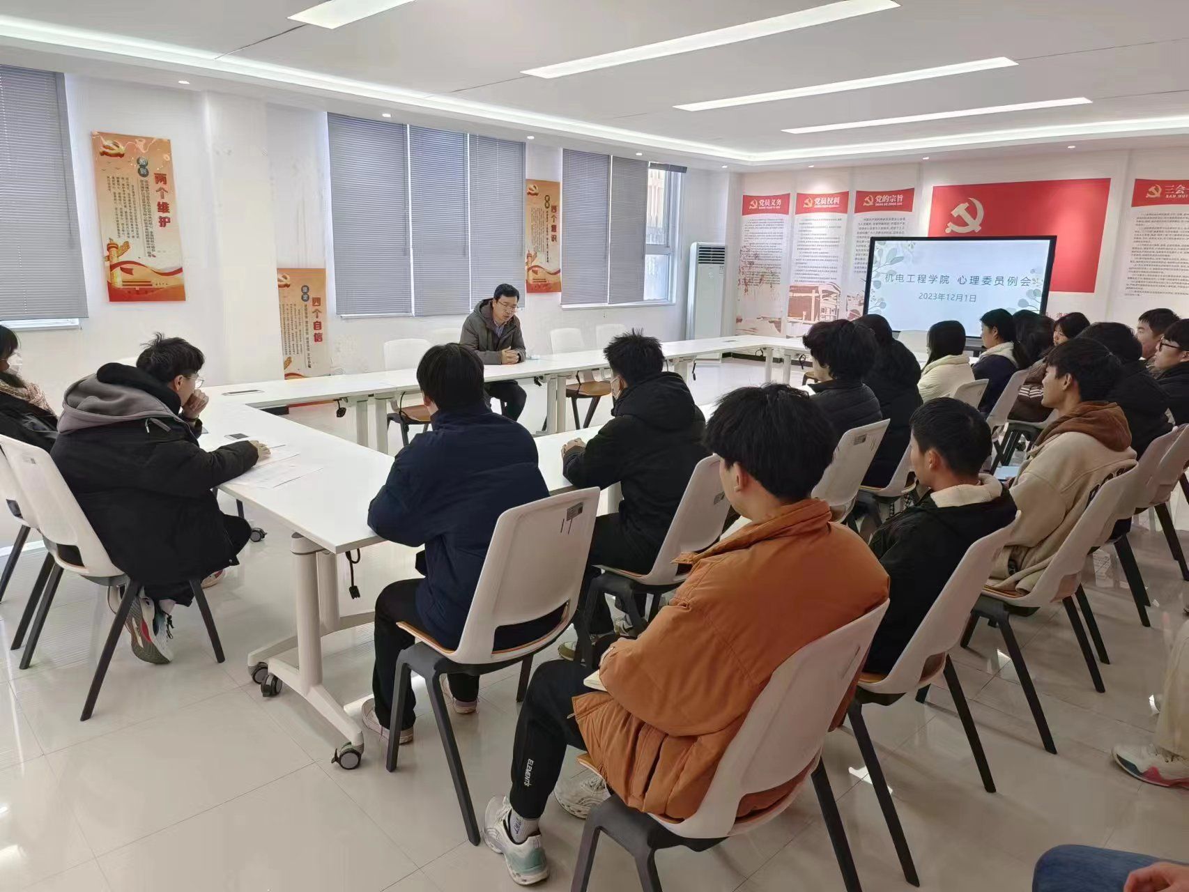 2023年12月1日,机电工程学院二级心理辅导站召开心理健康工作例会,会议由负责人马彦锋主持,心教部和各班心理委员参加。