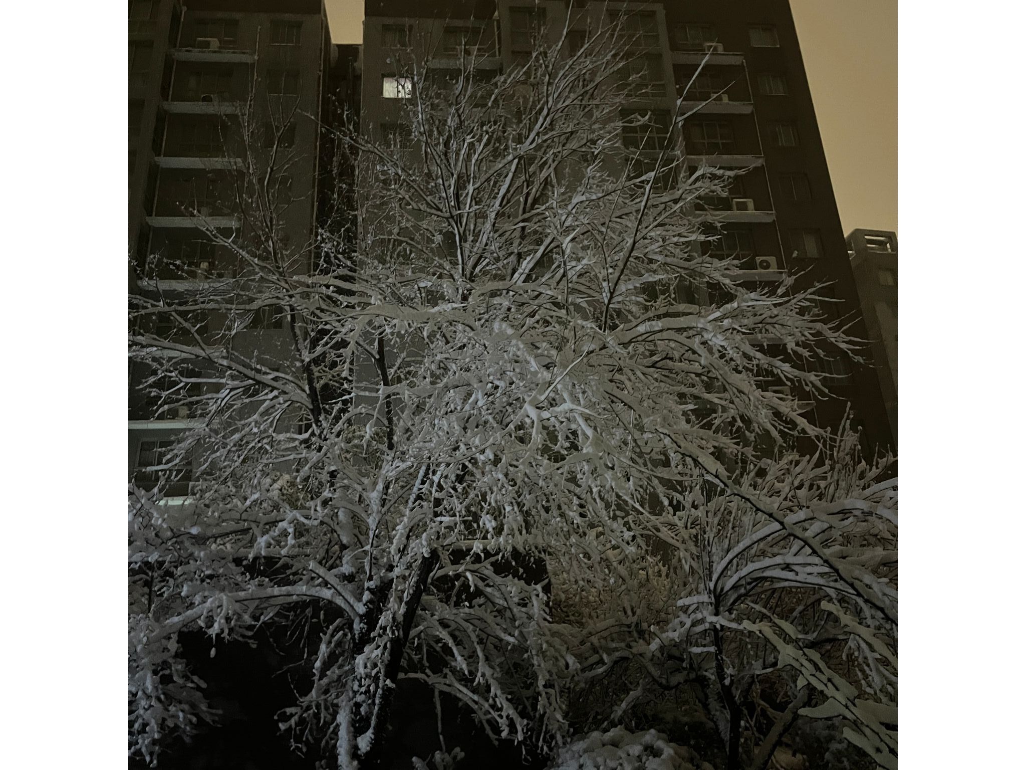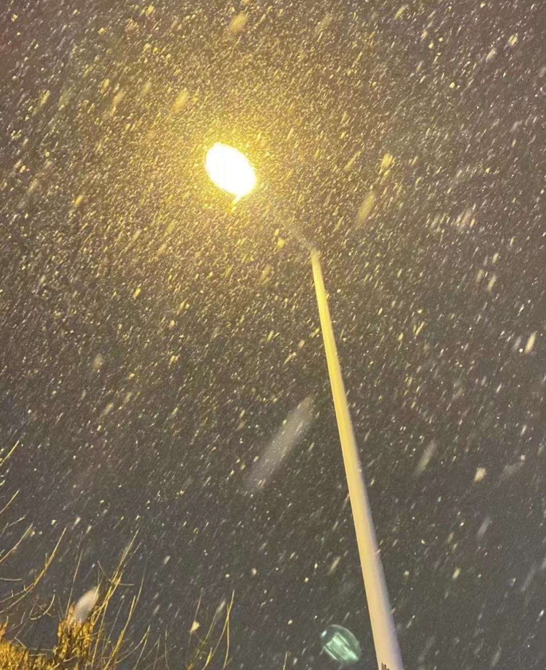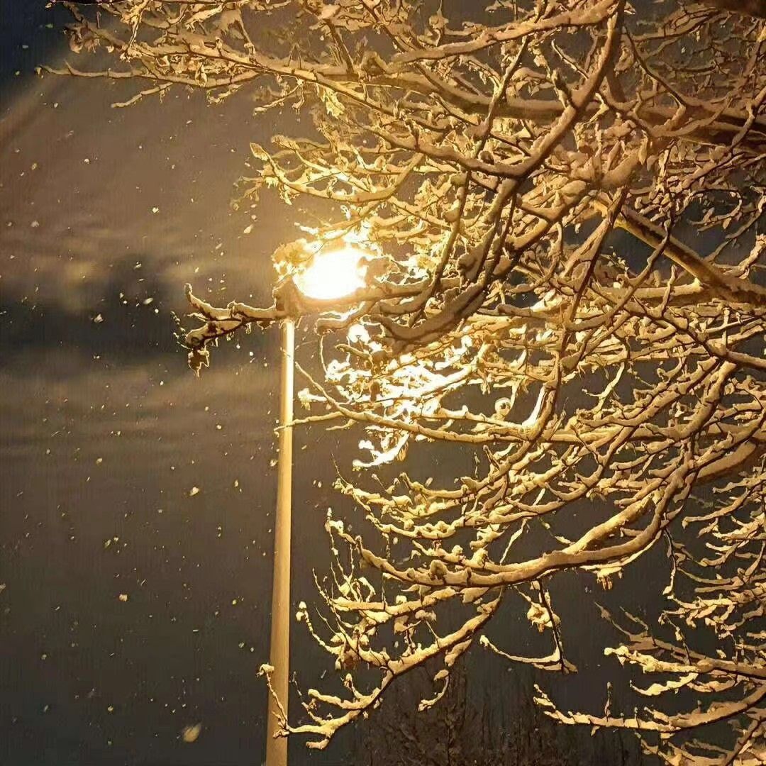 作品描述:灯光下的雪令人惊讶。强烈的光线照射在雪上,雪就像