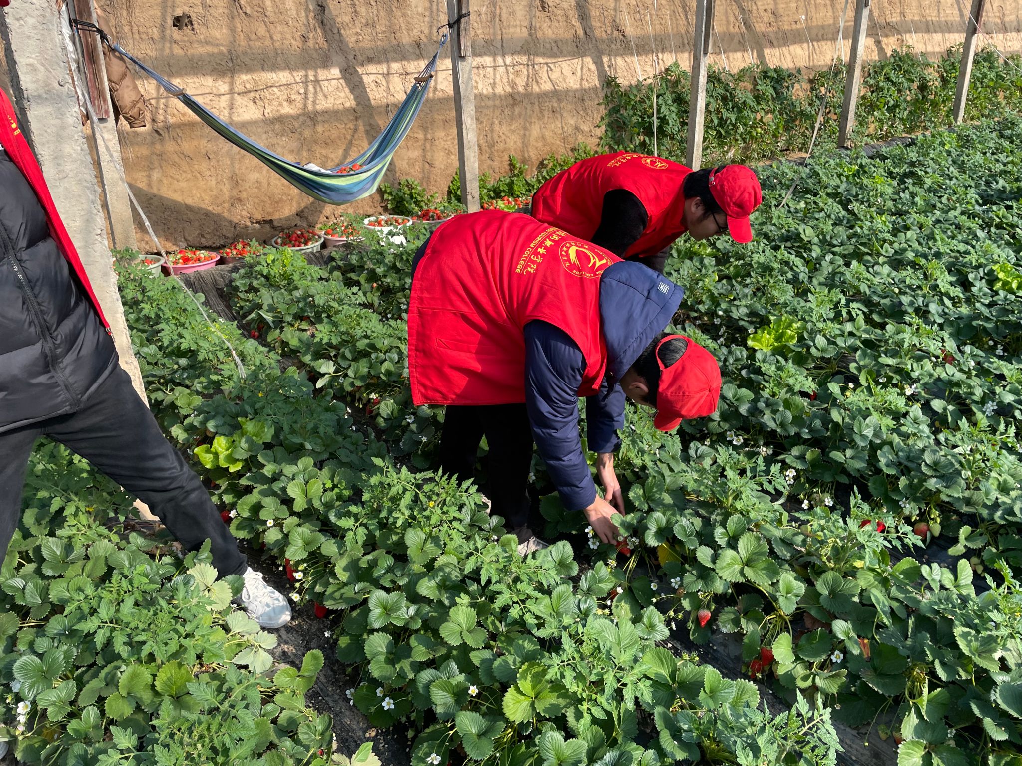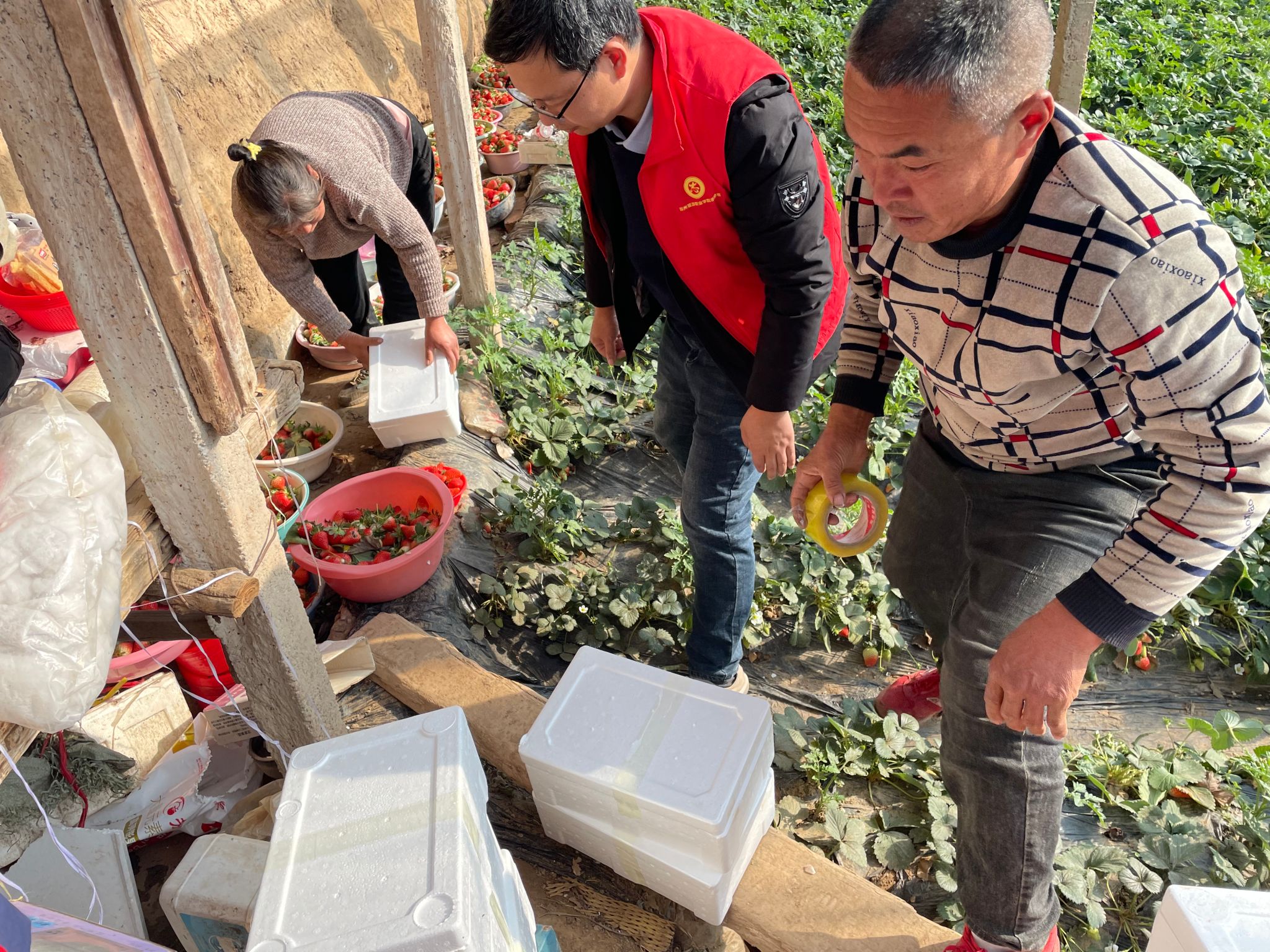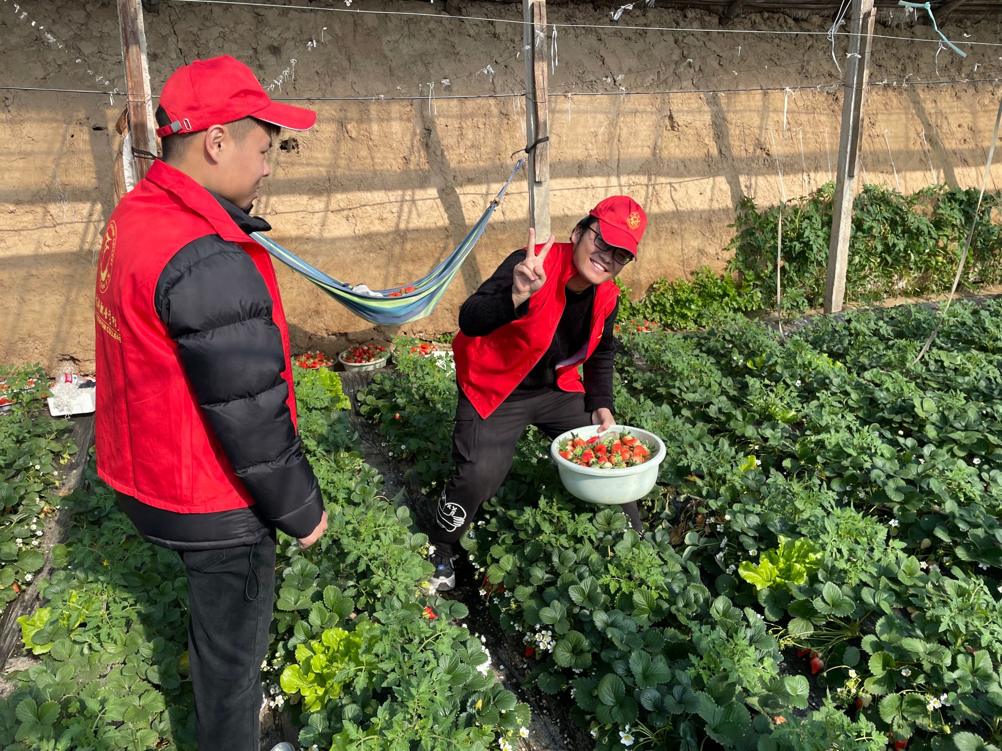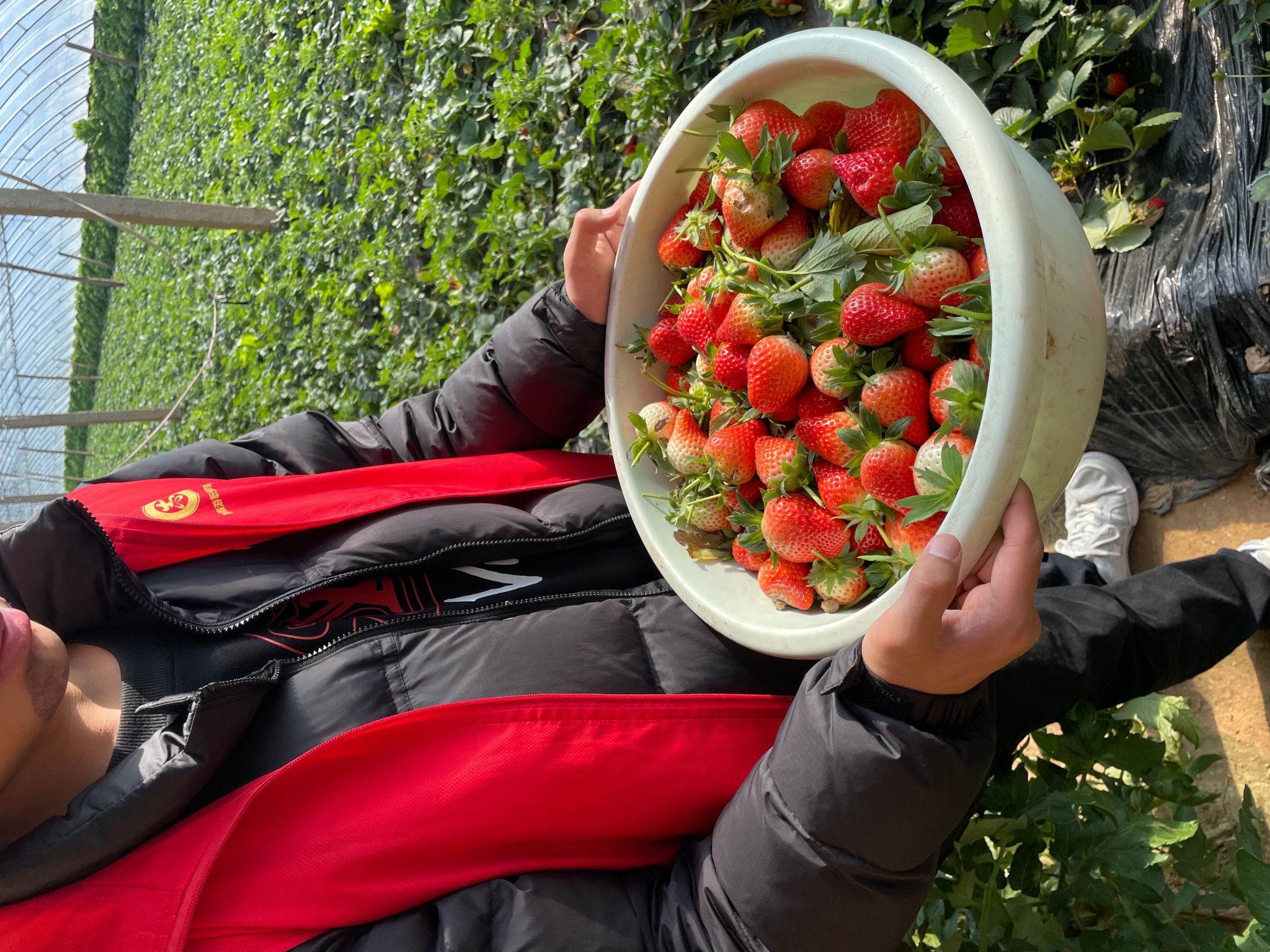 田庄村是当地有名的大棚种植基地,此时正值草莓上市旺季。此次实践活动主要了解当地大棚种植情况,帮助农户采摘草莓,开展志愿助农工作。到达目的地后,志愿者们在农户的带领下直接进入草莓大棚开展采摘工作。在农户的指导下,同学们顺着田垄,弯下腰,小心翼翼地把一颗颗成熟的红艳艳的草莓摘下来放到框里,再一个个装箱、封装。虽然很累,但看着自己的劳动成果,大家脸上洋溢的欢乐的笑容,享受着丰收的喜悦。期间大家向农户认真学习,了解到草莓的种植、栽培、管理、销售、收益等课堂以外的知识,在田间地头切身体验了一堂生动的劳实践课。