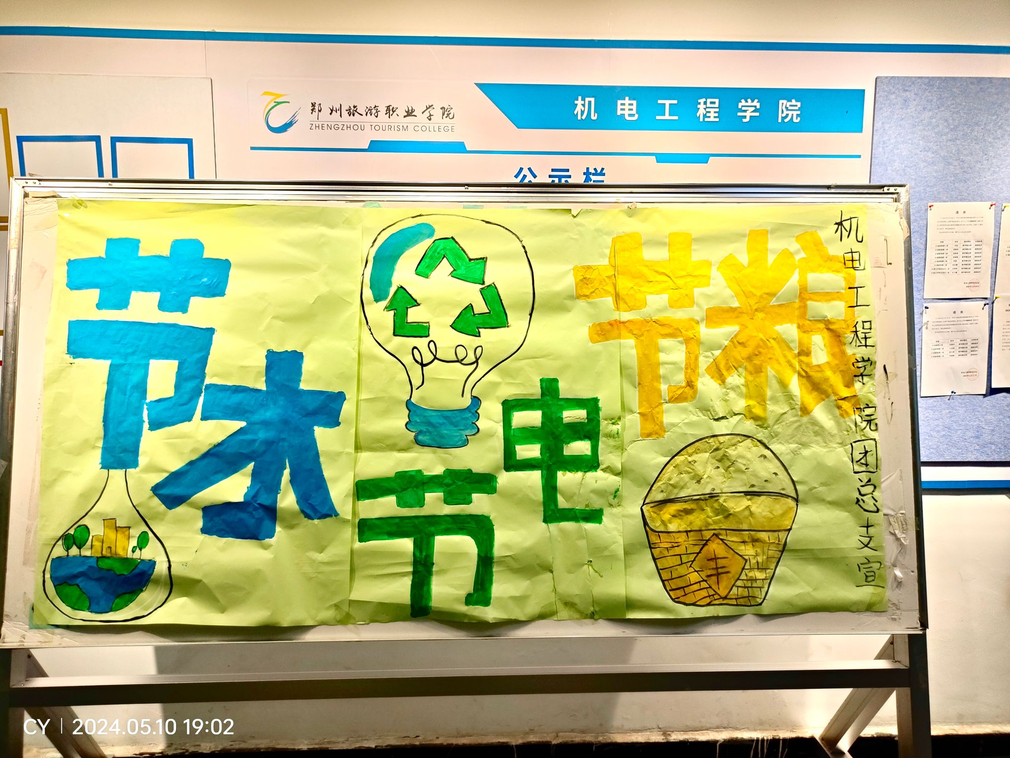 勤俭节约是中华民族的传统美德,为教育学生树立勤俭节约意识,形成节约光荣、浪费可耻的新风尚。机电工程学院于5月14日开展了教学楼“节粮、节水、节电”宣传活动。