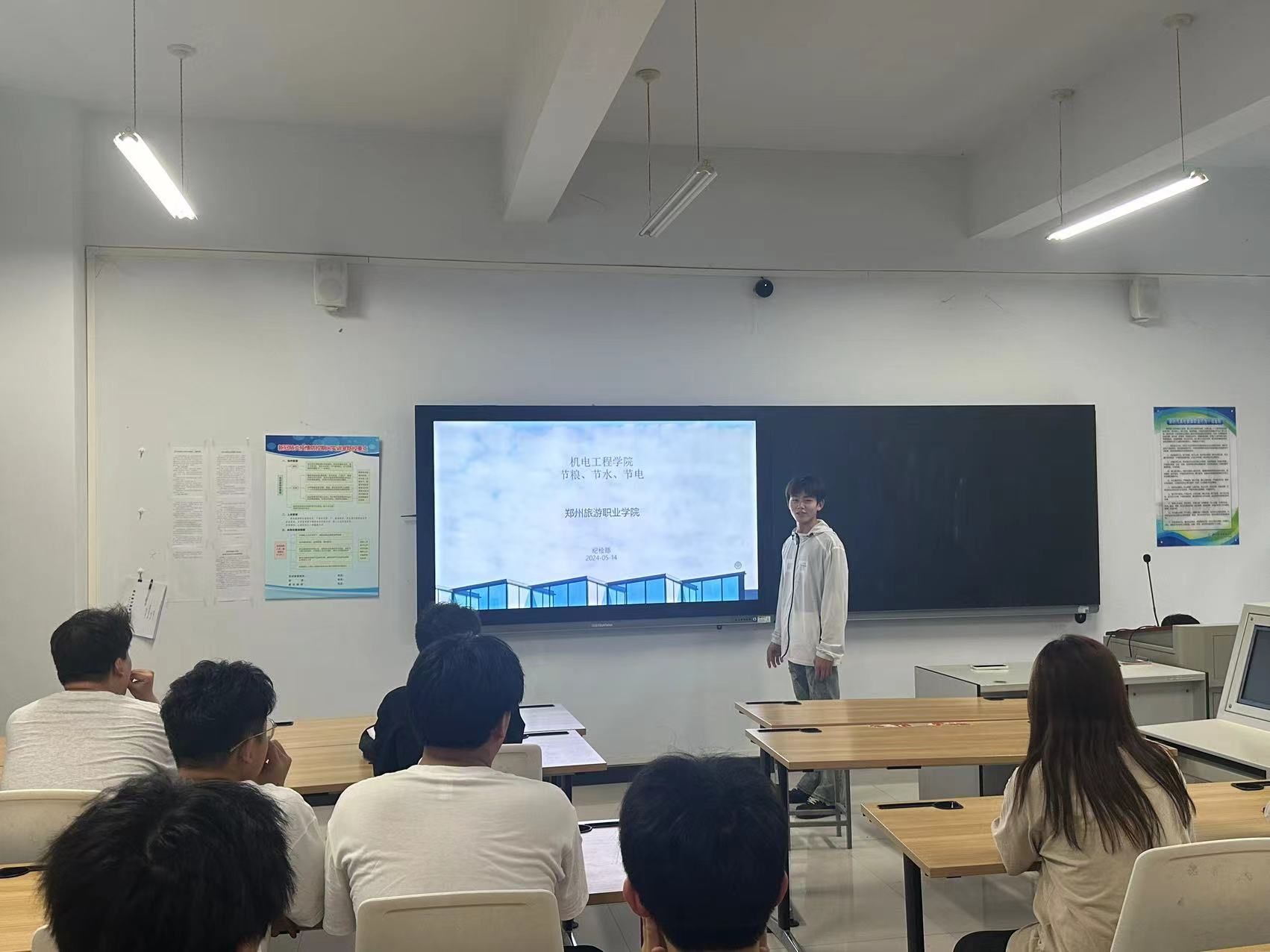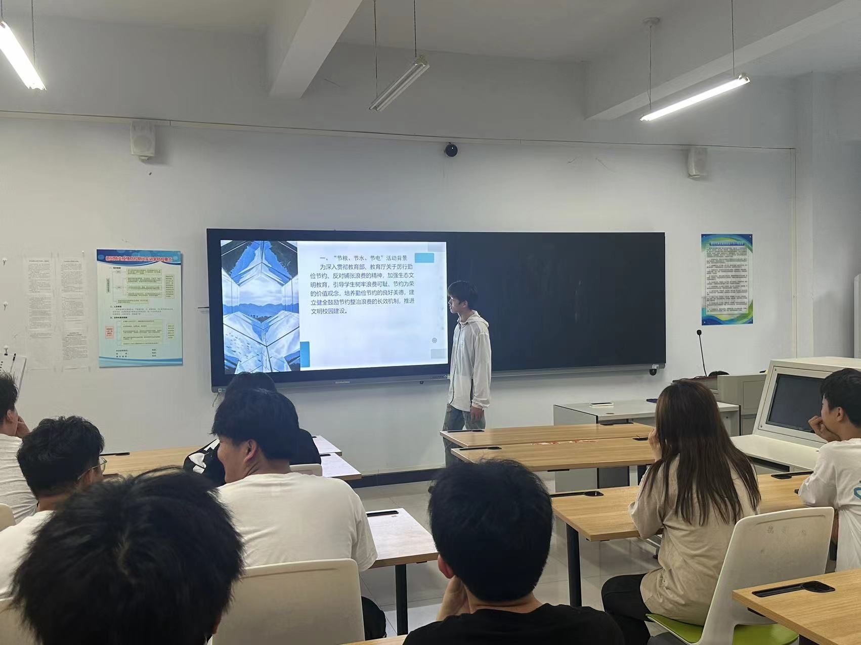 同时,主题海报也在教学楼内精彩呈现,这些充满创意和感染力的海报,进一步激发了大家践行“节粮、节水、节电”的热情。节电倡议也在教学楼各个角落得到了切实响应,随处可见的节电提示标语时刻提醒着大家珍惜每一度电。志愿者们活跃在食堂和卫生间等地,耐心地进行节粮、节水监督和引导,让节约之风在校园中盛行。