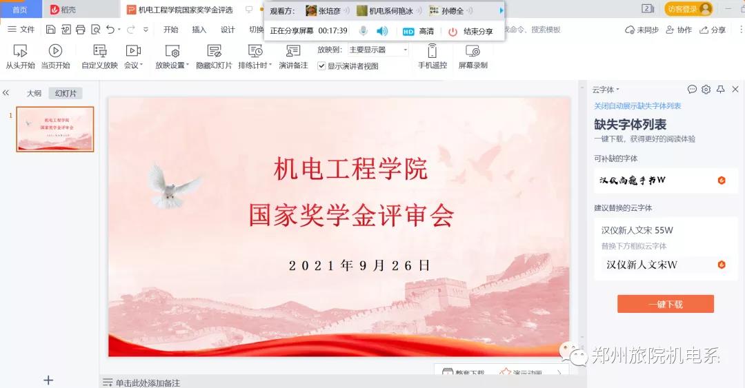 根据《河南省学生资助管理中心关于做好2021年高校学生国家奖助学金评审发放工作的通知》(豫教资〔2021〕45号),结合pp电子《2021年家庭经济困难学生认定及国家奖助学金评审工作安排》,机电工程学院于9月26日19:00召开了2020-2021年度国家奖学金评审视频会议,会议由资助工作负责人杨彦平主持,机电工程学院党总支书记张培彦、班主任代表及全体辅导员组成评审组,对各班推选的国家奖学金候选人进行线上评审。