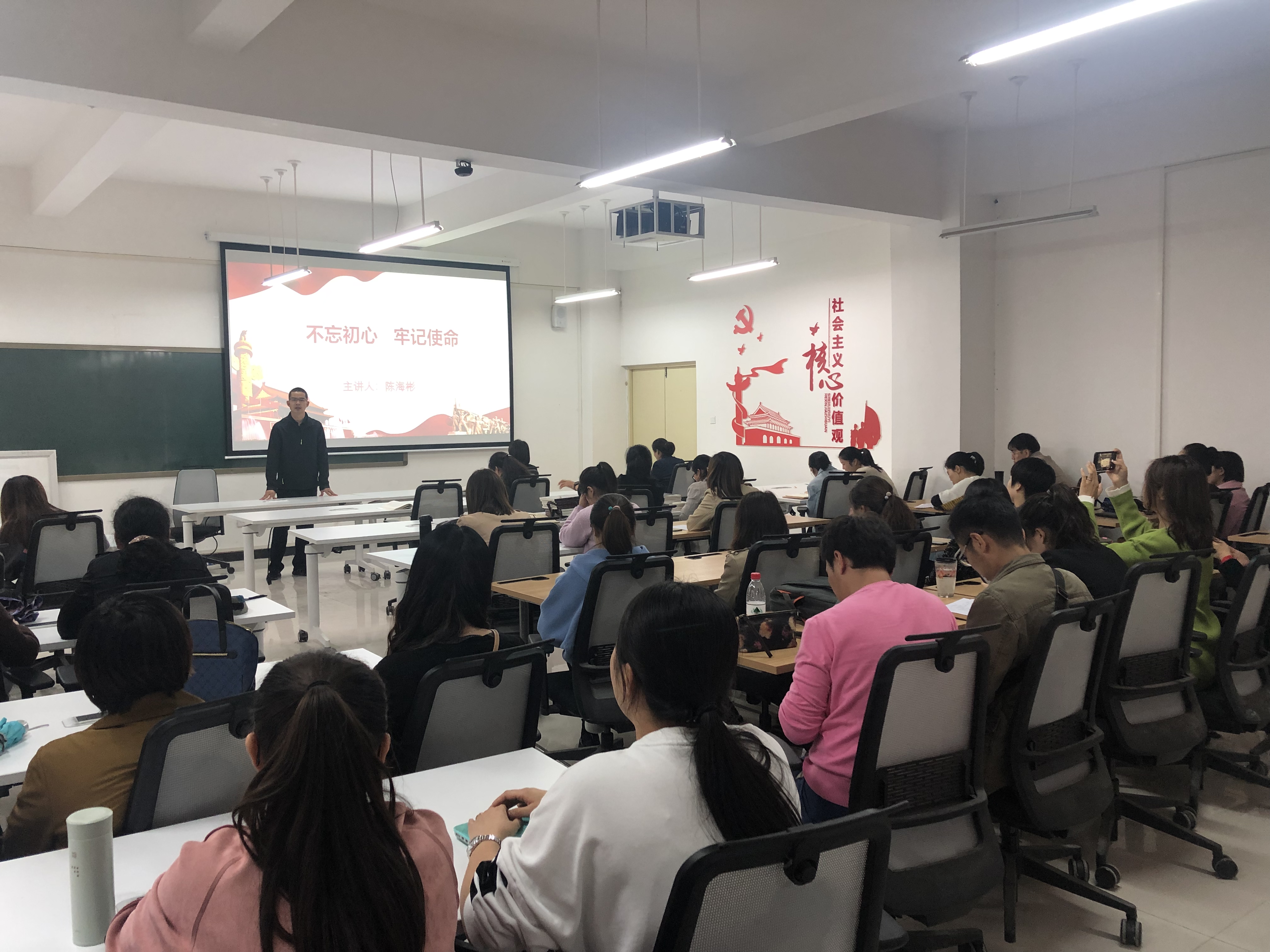 2019年10月9日下午,酒店管理学院党总支副书记陈海彬在2号楼B104会议室,以“不忘初心、牢记使命”为题,为酒店管理系全体教职工上了一堂精彩党课。
