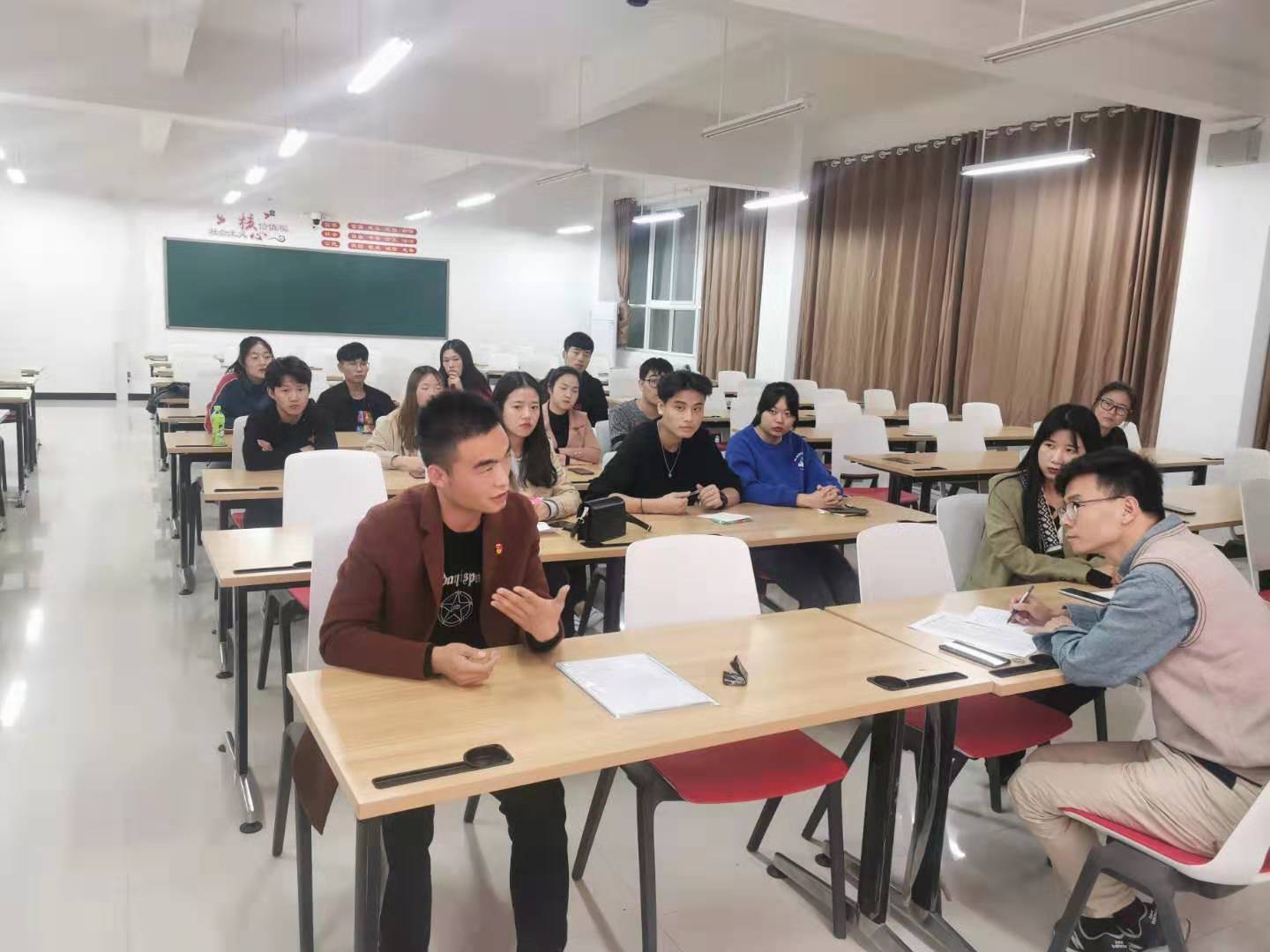 牛亚飞老师首先给同学们提出关于如何更好支部建设的方法,如何让学生提高党性工作,提出建设性的建议,其中包括了深入贯彻“不忘初心、牢记使命”、提高红色革命精神等问题,使学生提高自身建设以及自己的素质。其次,牛老师让同学们对志愿者活动建设应开展什么样的活动进行讨论,学生根据实际提出了观看红色电影、借阅红色书籍来评选“明日之星”活动、观赏红色革命根据地、捐献物资帮助学校附近贫困人口来贯彻“扶贫攻坚”的战略。最后,关于对加强学生管理提出了一系列的问题,例如:面对学生工作不积极、不服从管理、对工作不认真、校园内不文明行为、逃课等,并思考解决的办法。