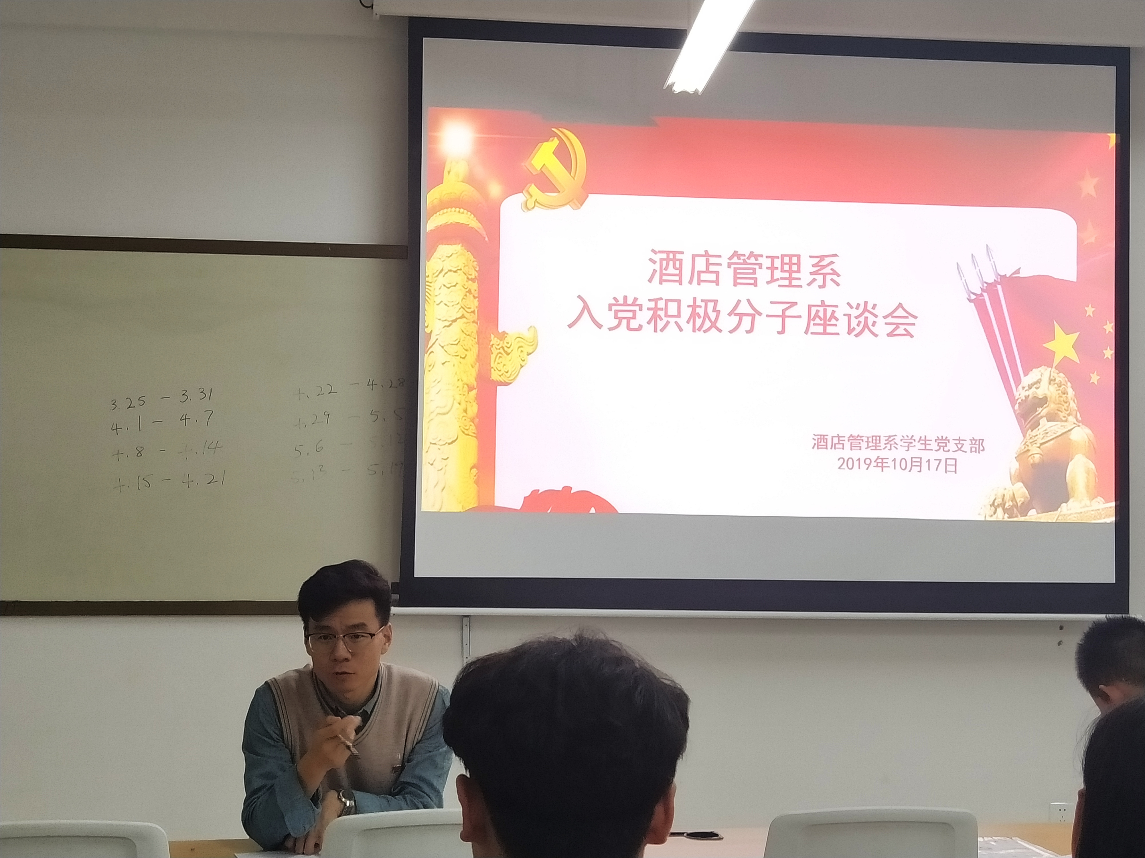 党支部是党的基础组织,党的组织体系的基本单位,党在社会基层组织中的战斗堡垒,党的全部工作和战斗力的基础,加强新时代党支部建设是推进全面从严治党的必然要求。为更好加强党支部建设,2019年10月17日晚,酒店管理学院学生党支部在2B302教室开展关于“加强支部建设,提高学生管理”的座谈会,座谈会由牛亚飞老师主讲,酒管学院入党积极分子及部分学团干部参加。