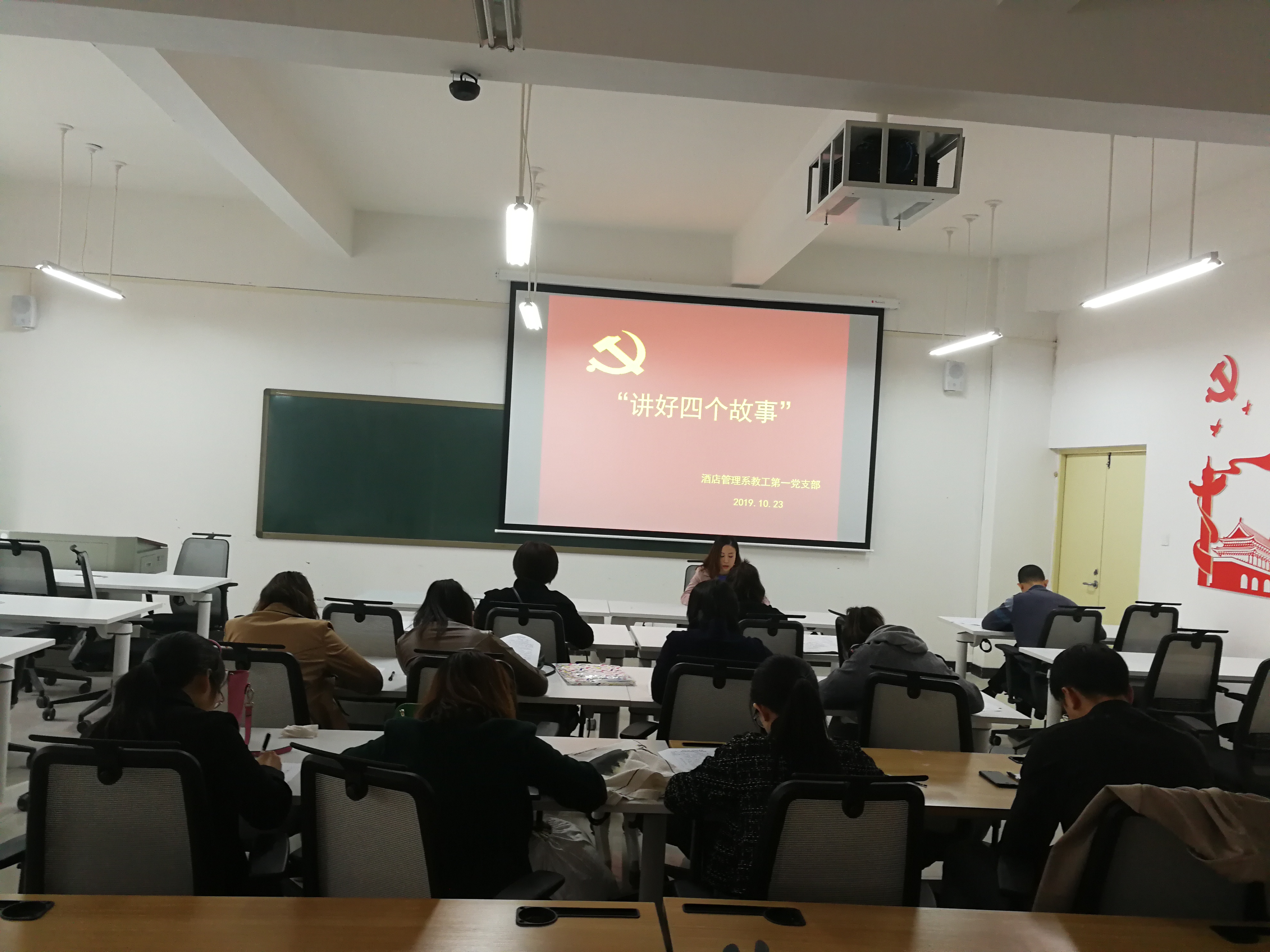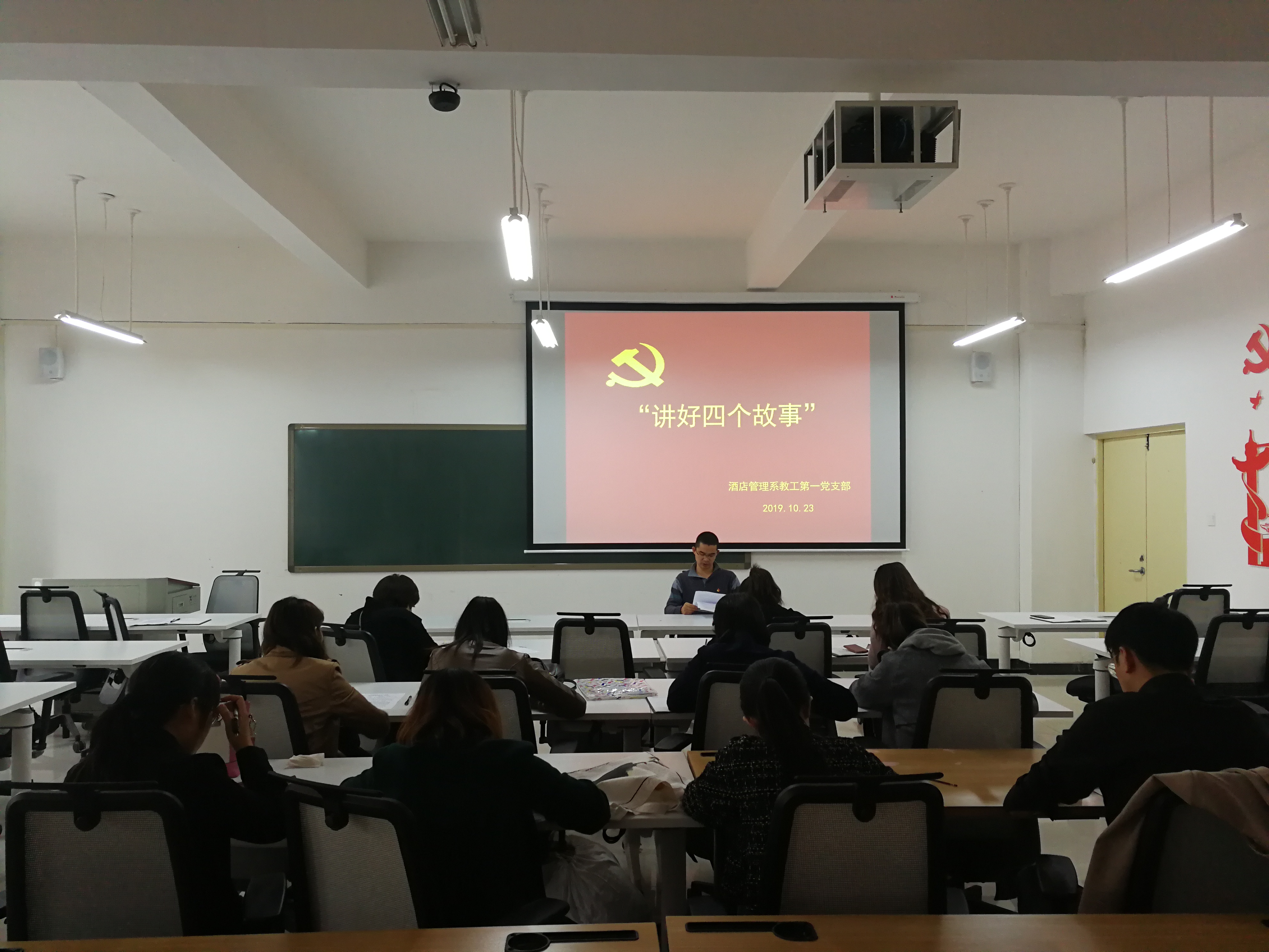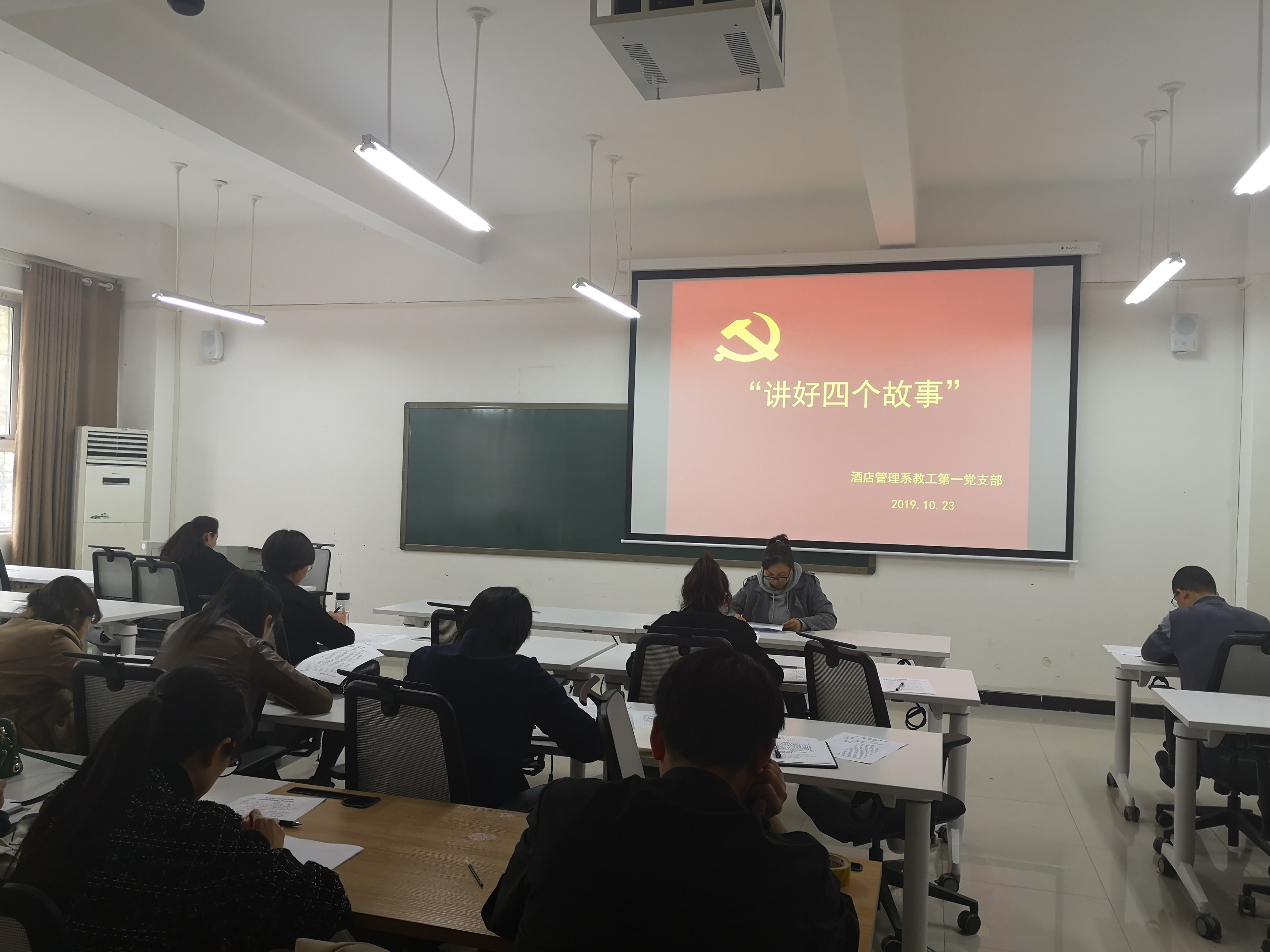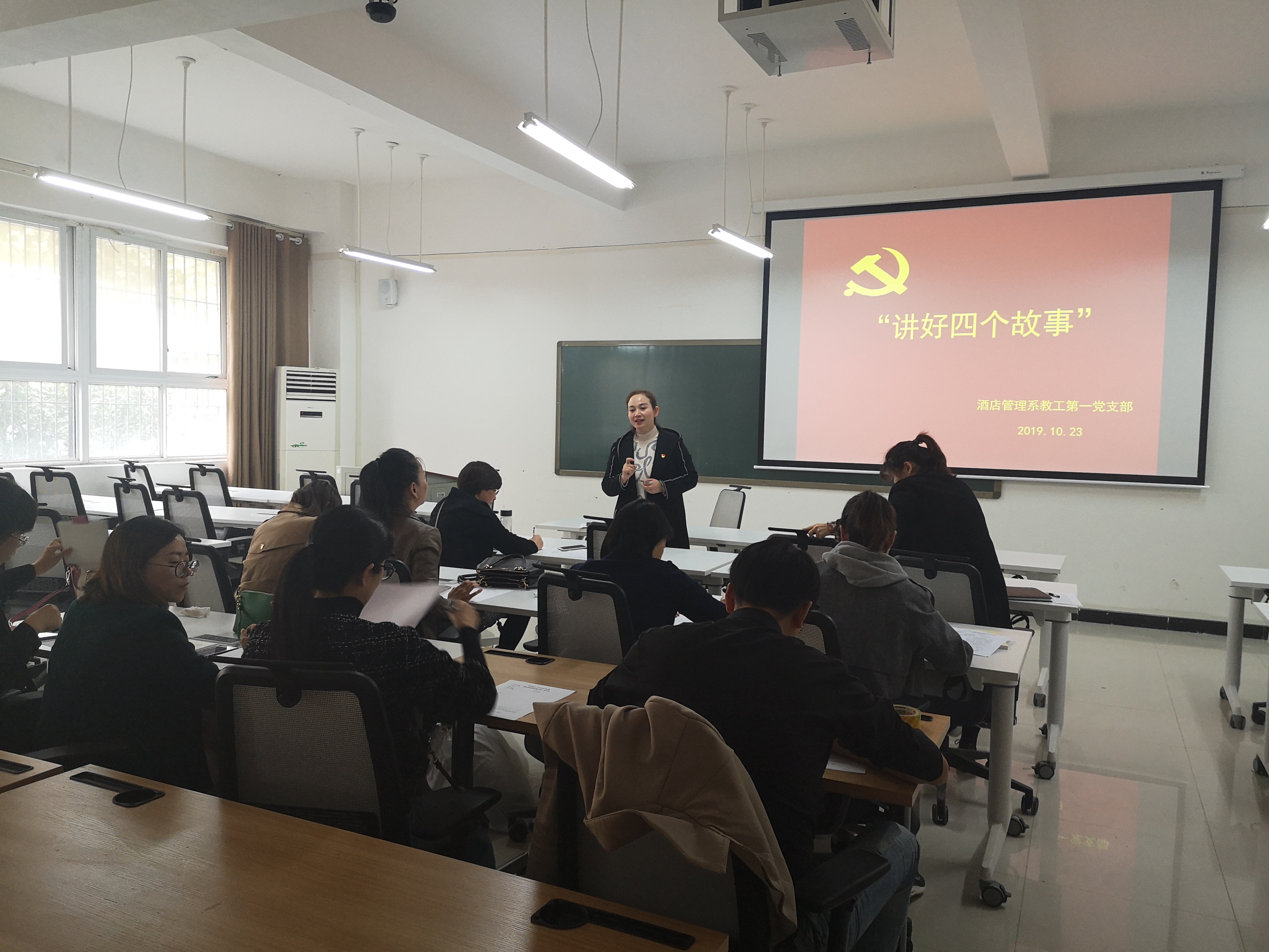 为深入贯彻落实习近平总书记考察调研河南时重要讲话精神,推动“不忘初心、牢记使命”主题教育活动深入开展。10月23日,酒店管理学院教工第一党支部在二号教学楼B104召开“讲好四个故事”主题教育大会,会议由党支部书记侯蕊主持。