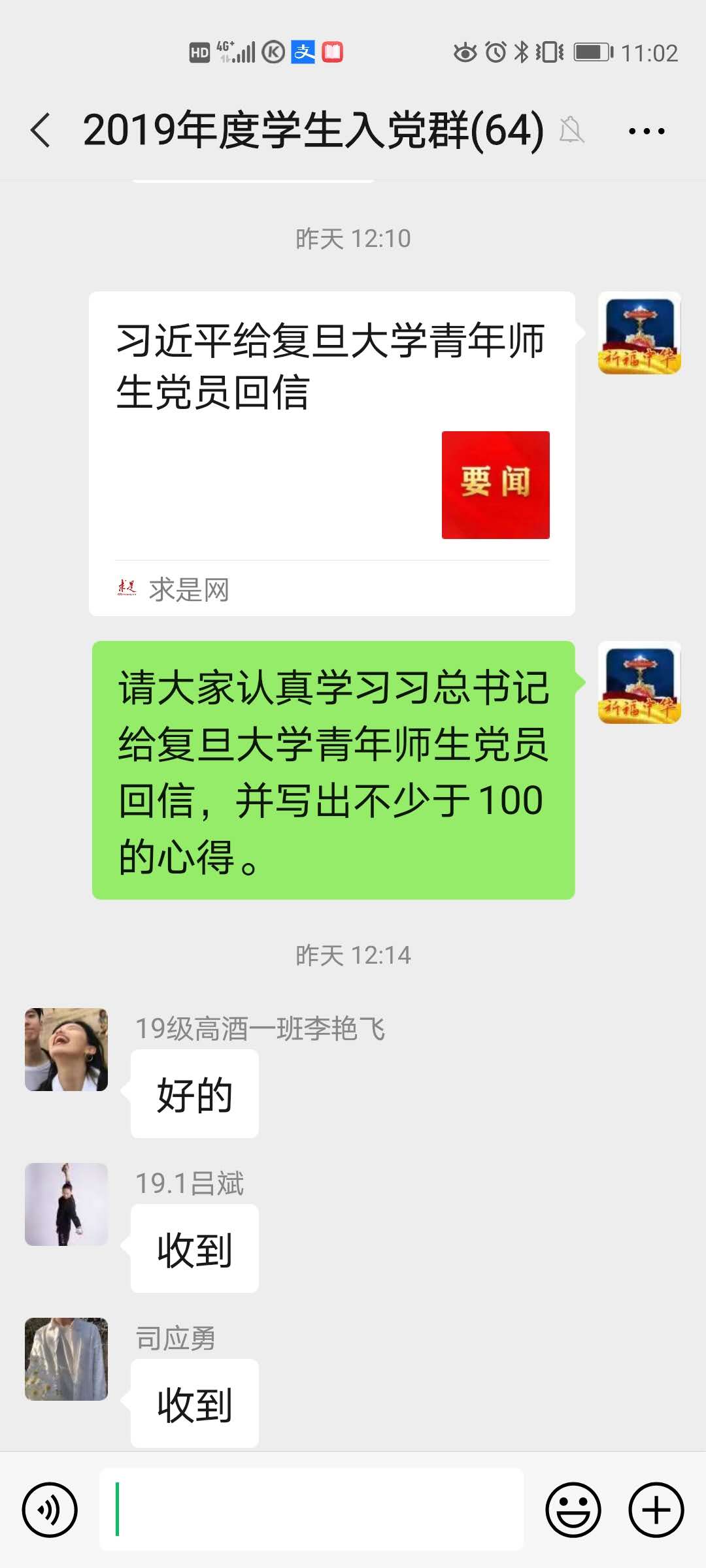 学习中,各位同志认真阅读了总书记给复旦大学青年师生党员的回信,深刻领会了回信的精神,特别是对总书记对青年学生提出的要求认真的进行了学习思考。同时,师生党员们根据学习的思考,认真撰写出心得体会,为自己的思想政治提升和个人成长树立了更加明确 的方向。