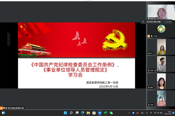 根据中共pp电子游戏平台网站纪律检查委员会要求,酒店管理学院教工第一党支部于2022年5月16日在腾讯会议以线上形式召开了《中国共产党纪律检查委员会工作条例》和《事业单位领导人员管理规定》学习会议,活动由支部书记张媛同志主持,支部全体党员参加。