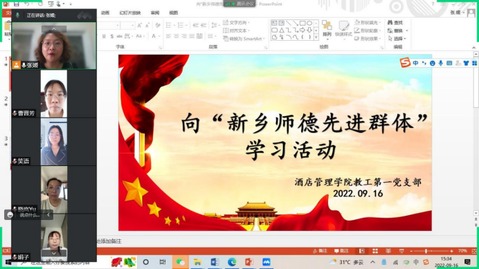 为进一步大力弘扬高尚师德师风,努力营造崇尚先进、学习先进、争当先进的浓厚氛围,按照学校党委宣传统战部通知要求,2022年9月16日,酒店管理学院教工第一支部通过腾讯会议开展了向“新乡师德先进群体”学习活动。活动由支部书记张媛同志主持,支部全体党员参加。