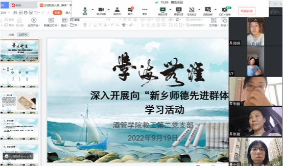 为大力弘扬新乡师德先进群体精神,酒店管理学院教工第二党支部于2022年9月19日下午在腾讯会议平台召开线上向“新乡师德先进群体”学习活动。会议由支部书记石磊同志主持。