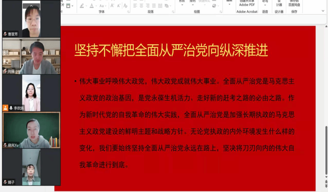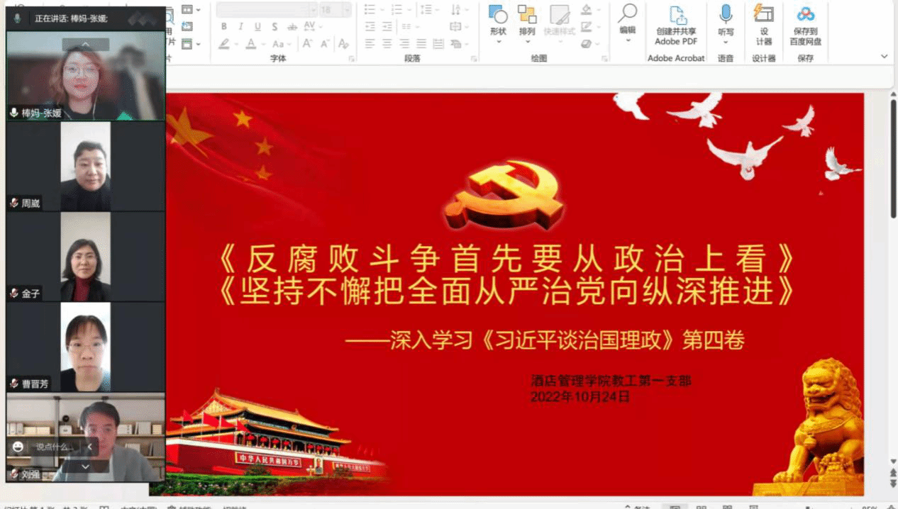 10月24日,酒店管理学院教工第一支部在腾讯会议以线上形式开展主题党日活动,深入学习《习近平谈治国理政第四卷》。活动由支部书记张媛同志主持,支部全体党员参加。