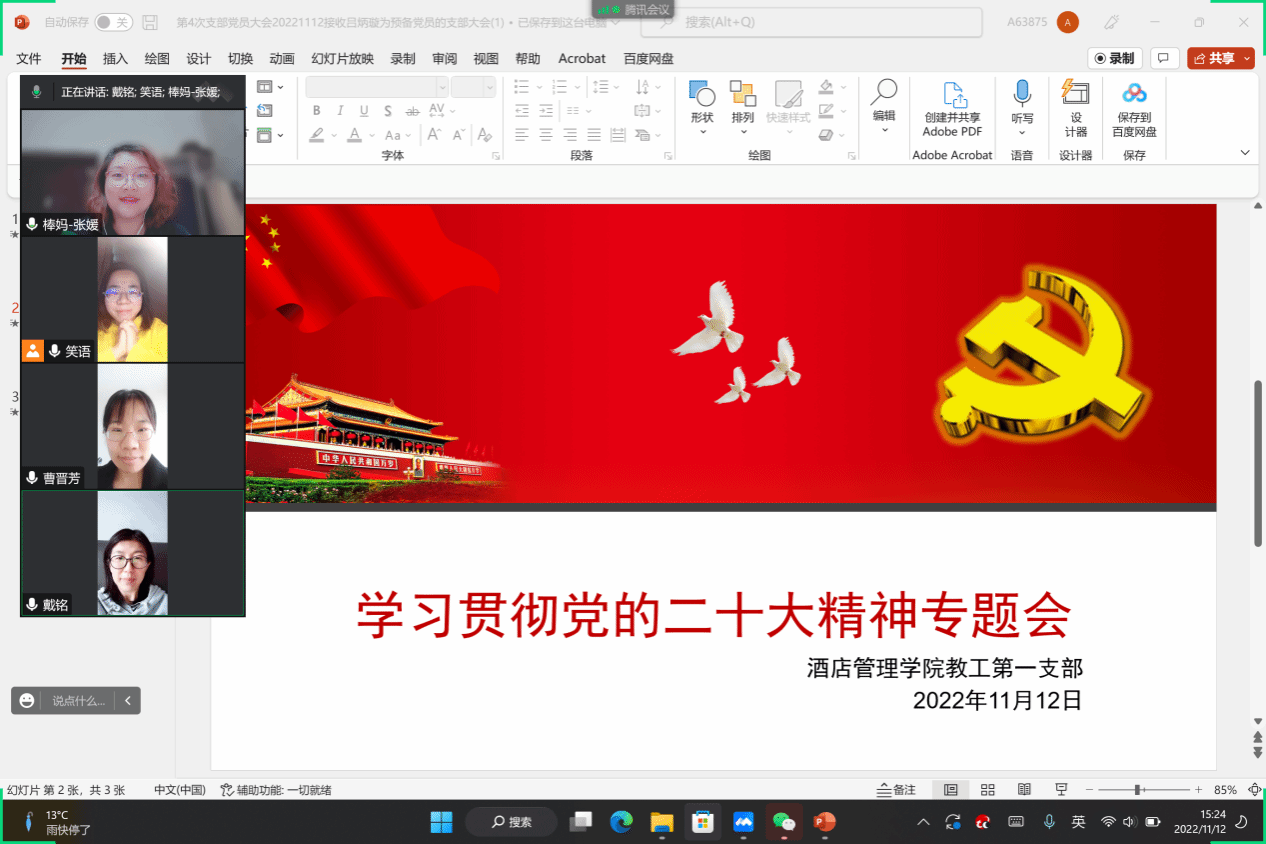 为深入学习宣传贯彻党的二十大精神,切实将党的二十大精神转化为立德树人的具体实践,2022年11月12日,酒管学院教工第一支部在腾讯会议以线上形式开展了“学习贯彻党的二十大精神”主题党日活动。活动由支部书记张媛同志主持,支部全体党员参加。