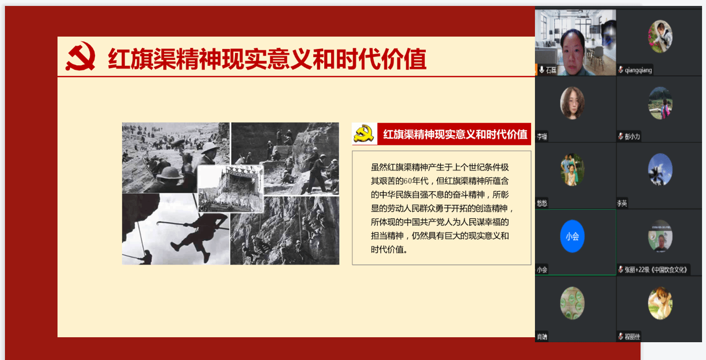 为深入学习贯彻党的二十大精神和习近平总书记视察安阳重要讲话精神,深刻领会红旗渠精神的丰富内涵和时代价值,弘扬伟大建党精神,不断增强基层党组织的组织力、凝聚力、战斗力。2022年12月20日下午,酒店管理学院教工第二党支部通过在腾讯会议平台开展红旗渠精神代代传主题党课活动,会议由石磊同志讲授,支部全体党员参加。