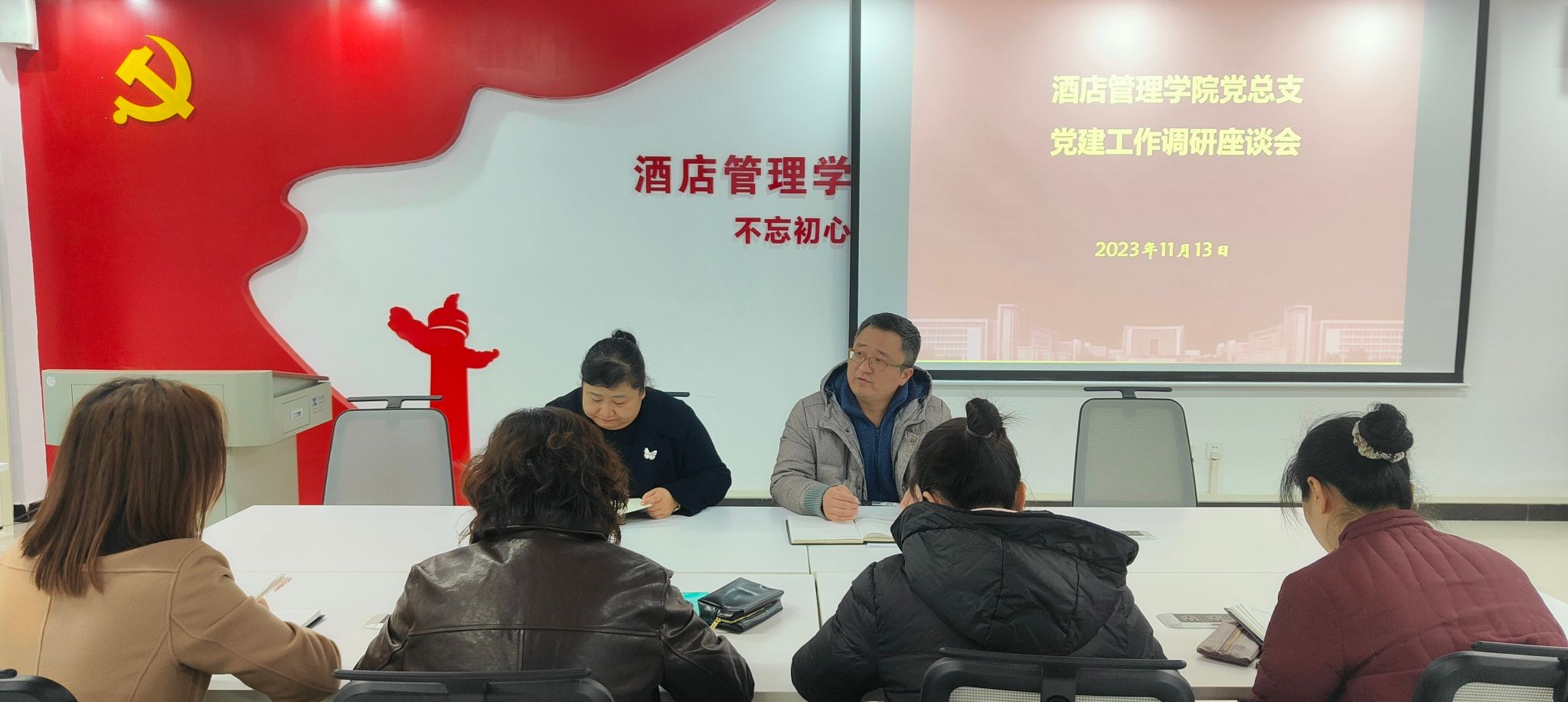 按照学院学习贯彻习近平新时代中国特色社会主义思想主题教育安排部署,为全面推进基层党建工作提质增效,2023年11月13日下午,酒店管理学院党总支召开党建工作调研座谈会, 酒店管理学院党总支书记郭防、党总支委员、各支部书记参会,会议由郭防主持。