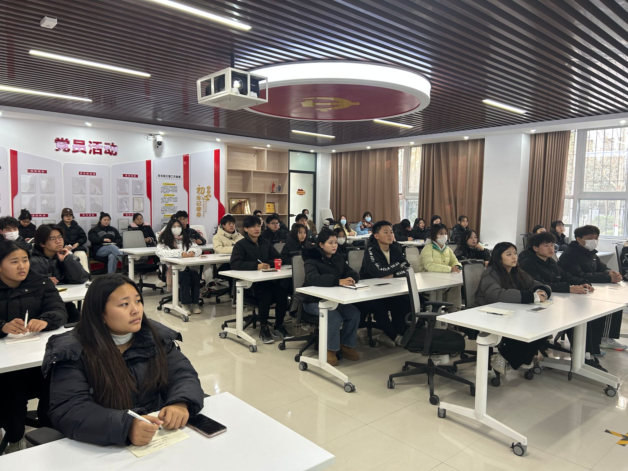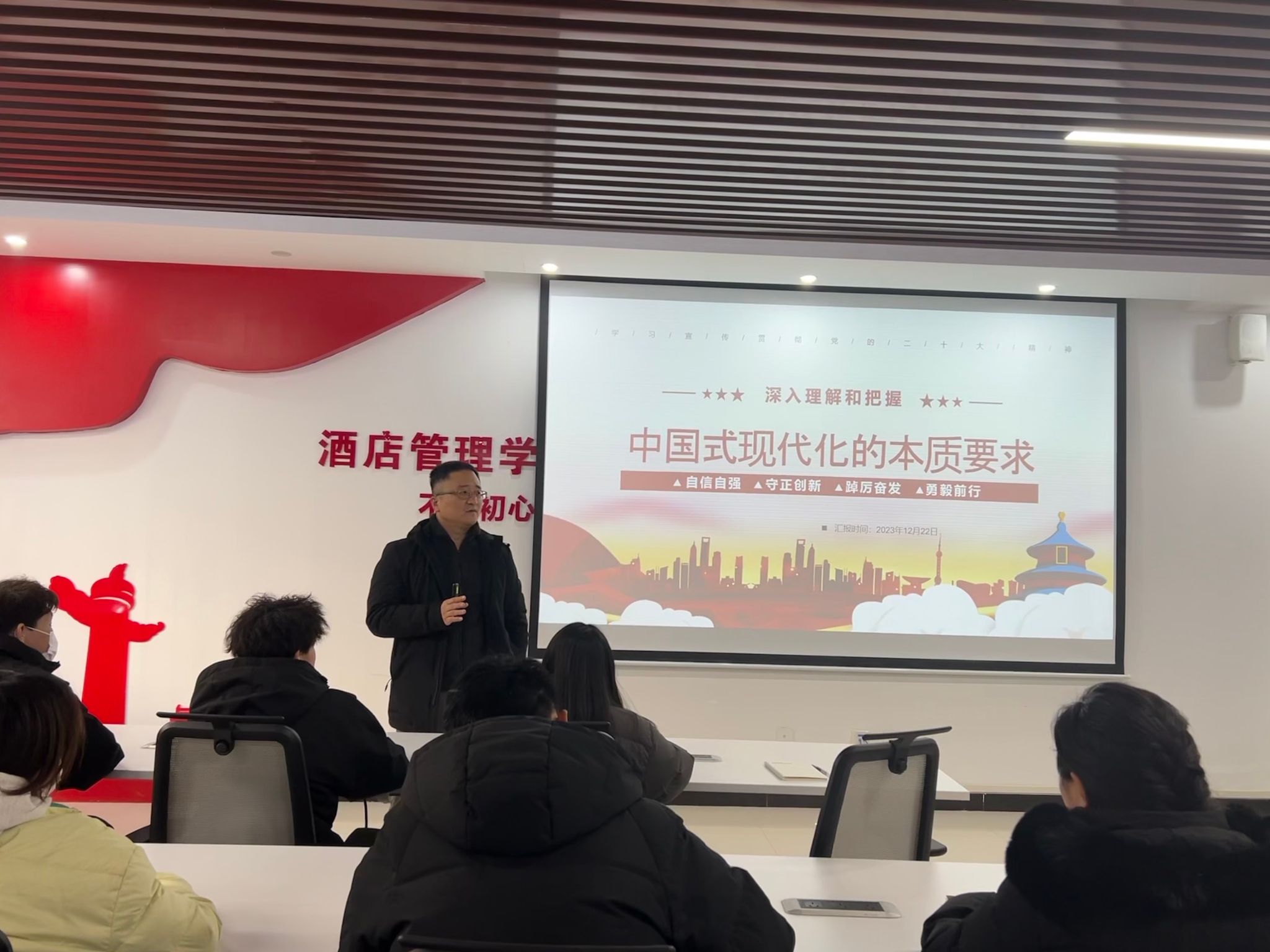 12月22日,酒店管理学院党总支书记郭防在党员活动室为学生们带来一堂以“深入理解和把握中国式现代化的本质要求”为主题的党课,酒店管理学院2023年度入党积极分子参加活动。