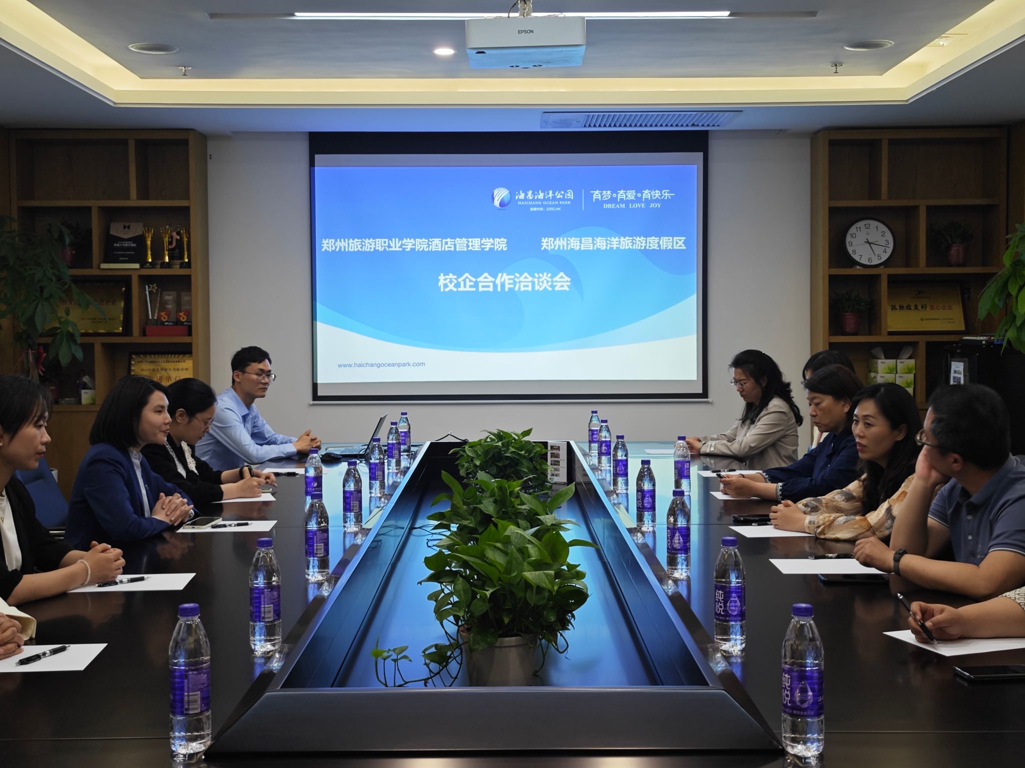企业负责人李靖部长对肖院长一行的到来表示热烈欢迎,并简要介绍了公司的发展进程与合作意向。通过企业的多角度介绍,学院的与会老师对郑州海昌海洋公园的度假酒店、海洋场馆等公司工作环境、企业文化和集团发展都有了较多了解。随后,双方就校企合作模式、校外实训基地建设、人才培养方案构建等问题进行深入交流。