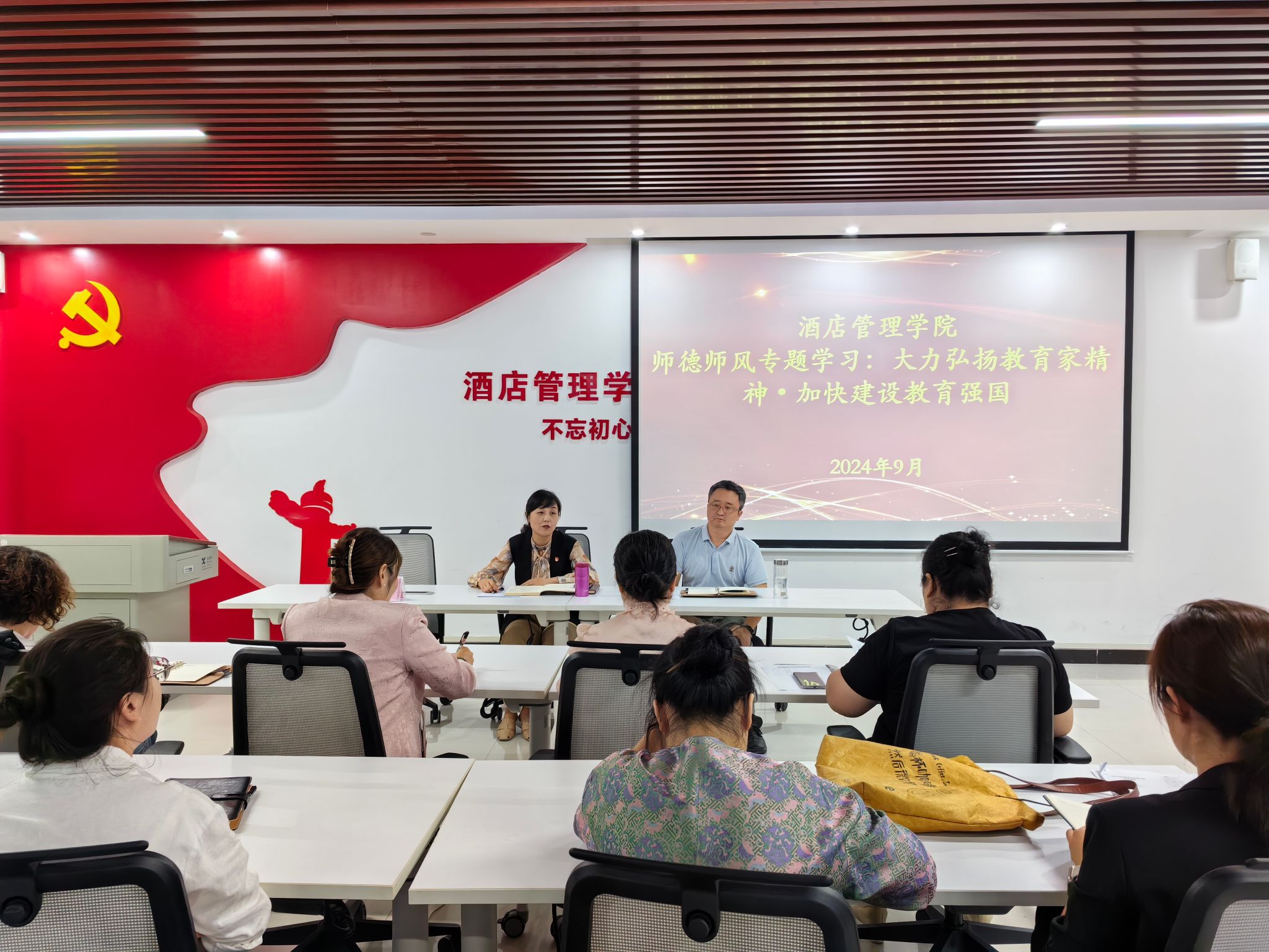 为深入学习贯彻《中共中央 国务院关于弘扬教育家精神加强新时代高素质专业化教师队伍建设的意见》精神,酒店管理学院于2024年9月18日下午在党员活动室组织开展“大力弘扬教育家精神·加快建设教育强国”师德师风专题学习。酒店管理学院党总支书记郭防、院长肖靖、副院长钱丽娟、副院长周崴以及全体教职工参会,会议由周崴主持。