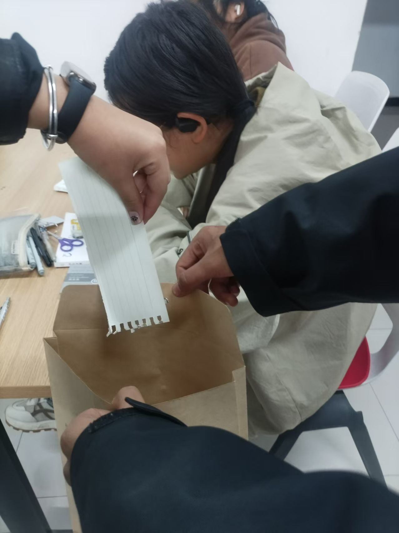 活动上,同学们将自己想倾诉的内容写到准备好的纸上,而后将其折纸后投送到制定的“树洞箱”当中。以“树洞”的形式,让同学们接纳自己所有情绪与心事,表达内心深处的情感,增强自我接纳能力和心理素质。活动中,同学们用手中的笔,在纸上写下自己的烦恼、心愿、疑问等等。随着信纸的投入与互相交流,同学们更加正视自己的内心,放下了过往。