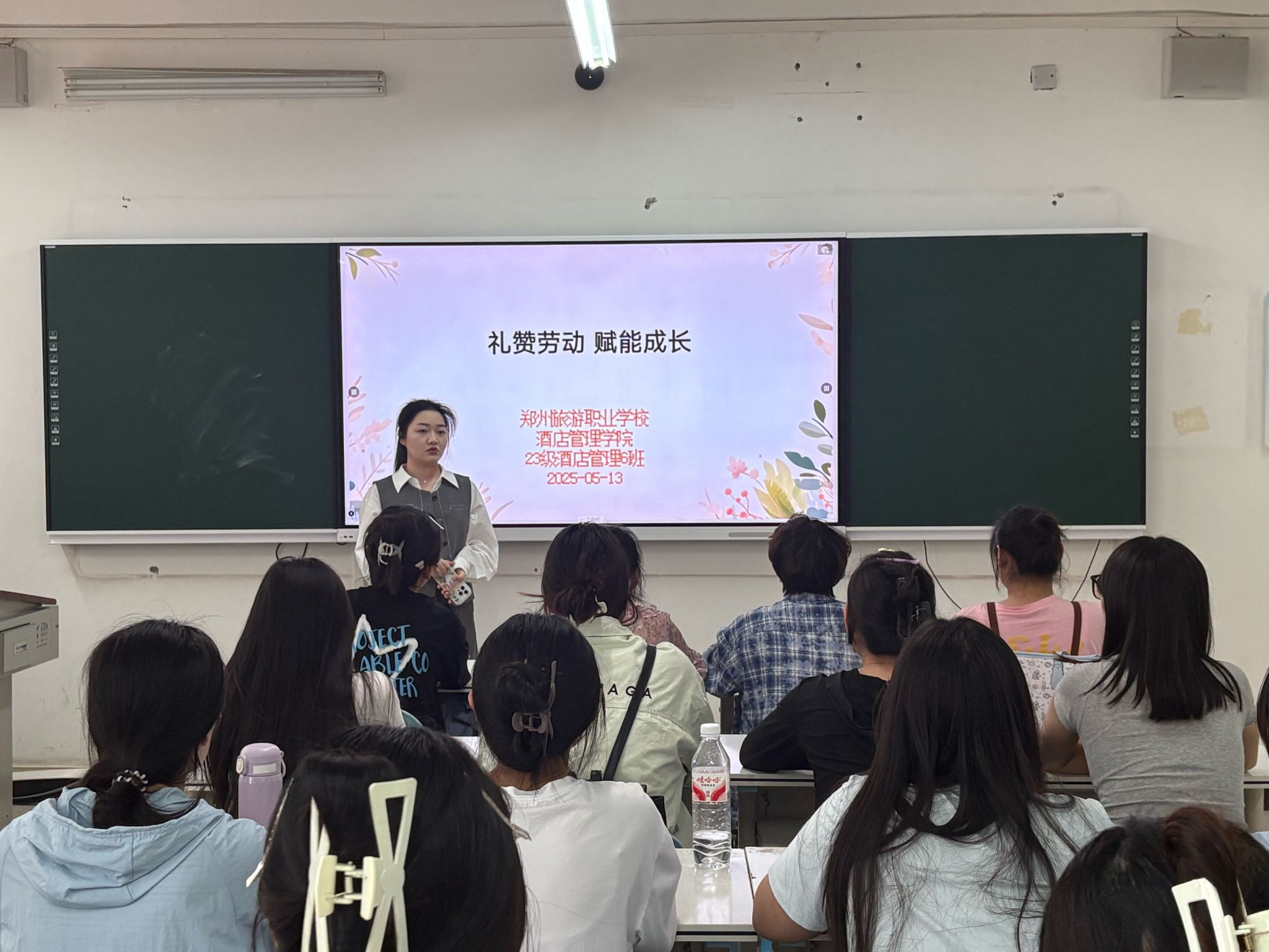 在班会上,班主任首先讲解了劳动的重要意义,从人类社会的发展历程引入,从原始社会人类通过劳动获取生存资源讲起,到现代社会劳动推动科技进步、经济发展,让学生明白劳动是人类发展的基石。班主任分享了诸多劳动模范的故事,如大国工匠徐立平,为导弹固体燃料发动机的火药进行微整形,在极其危险的岗位上默默奉献,用精湛技艺诠释劳动精神。还结合酒店管理专业,讲解酒店工作人员从客房服务到餐饮筹备等各环节的劳动,让学生理解劳动无高低贵贱之分,每一份工作都值得尊重。同时,强调劳动对个人成长的作用,像提升沟通能力、增强责任心等。此外,班主任鼓励学生积极参与校园劳动实践活动。