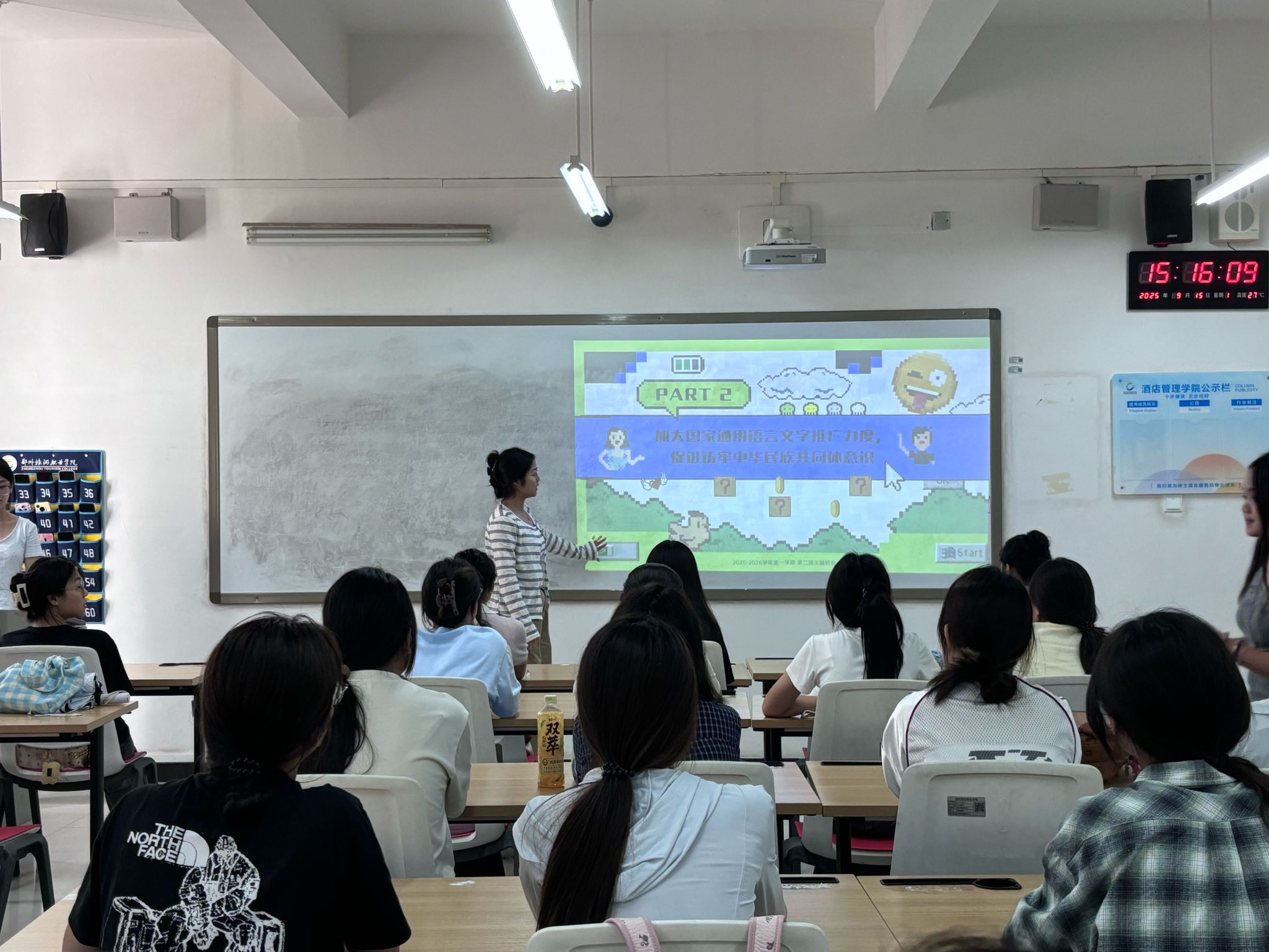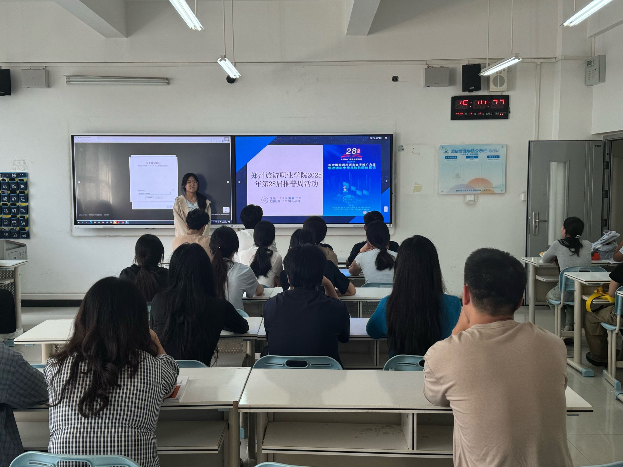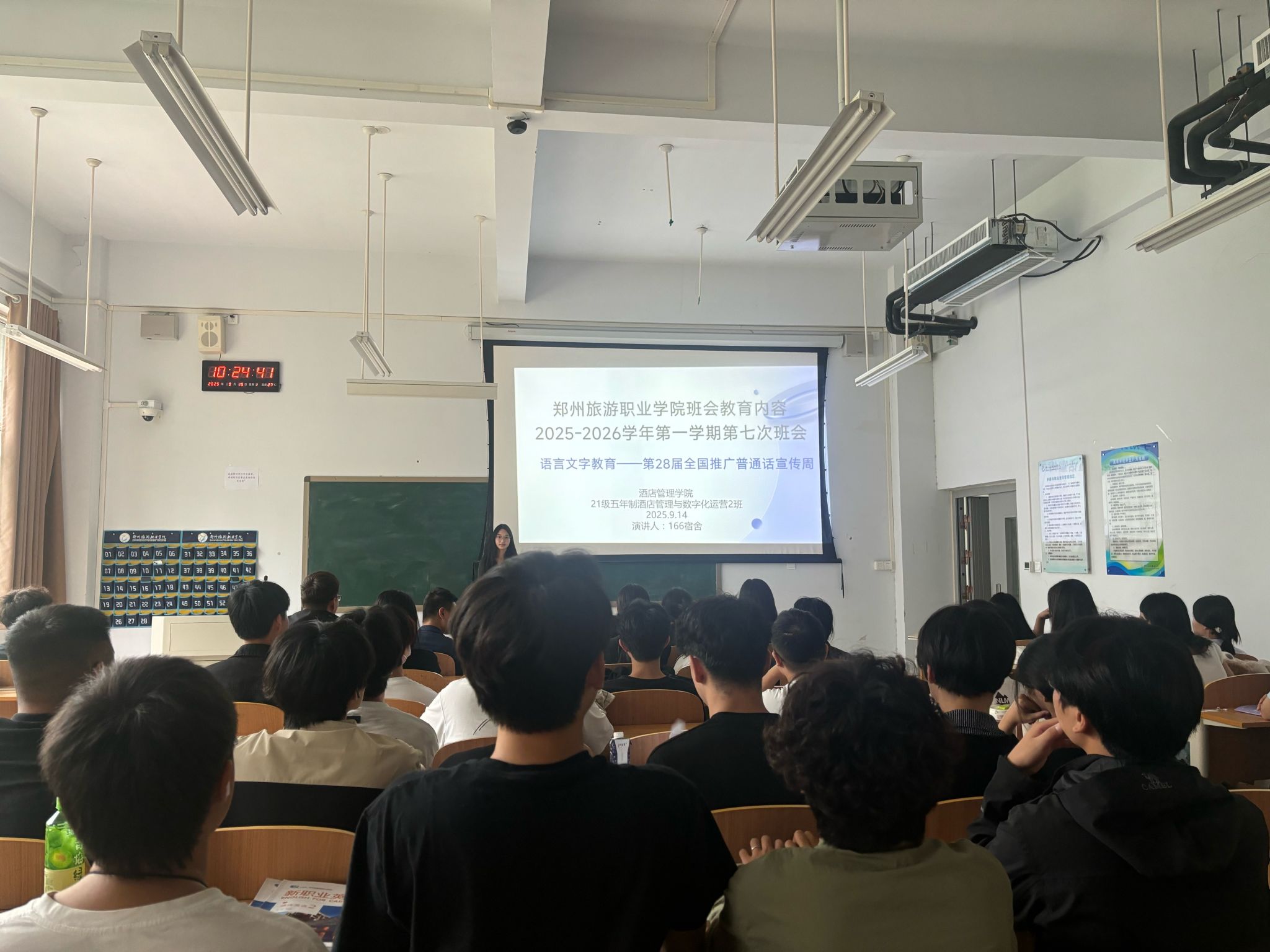 为了积极响应第28届全国推广普通话宣传周活动,增强大学生语言文字规范意识,提升普通话水平,酒店管理学院于本周在敏行楼组织召开推广普通话主题班会。
