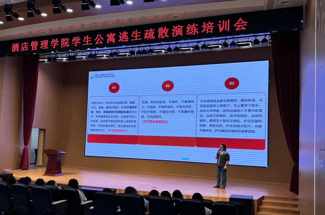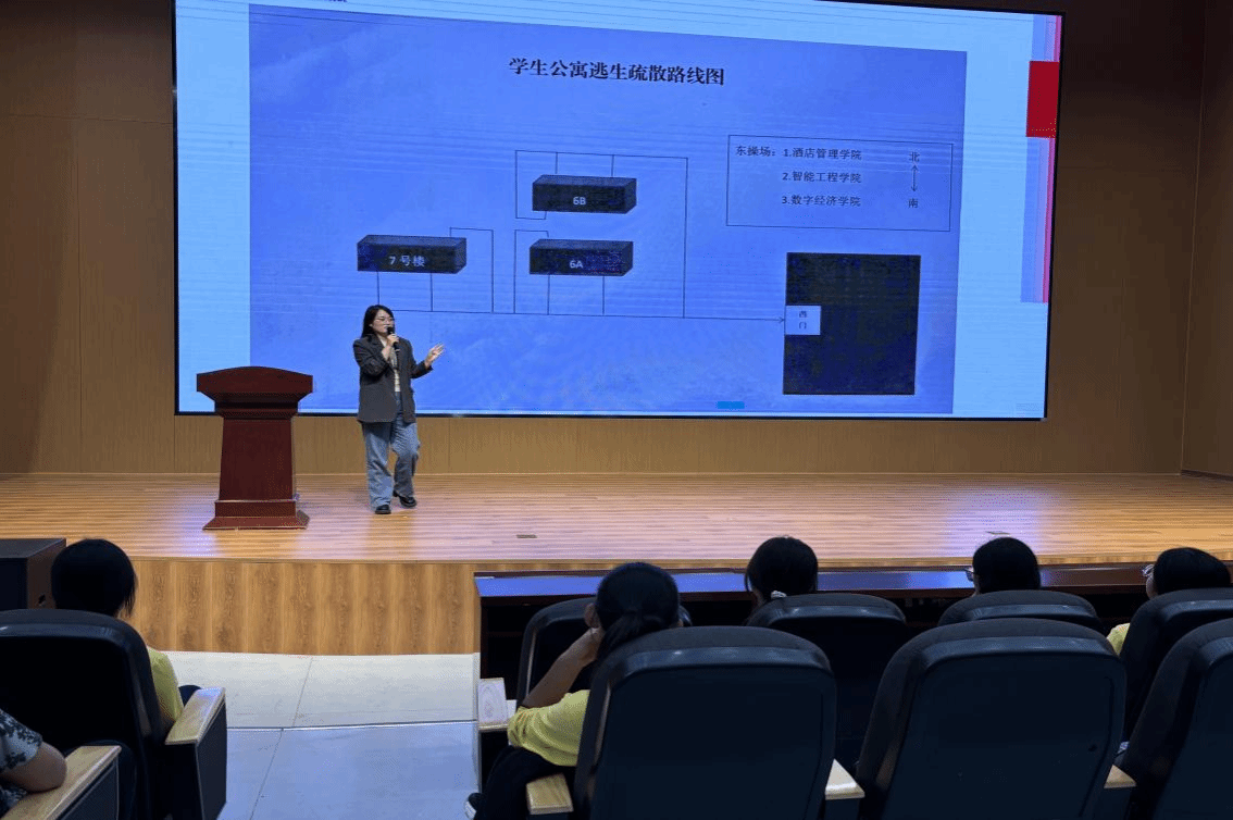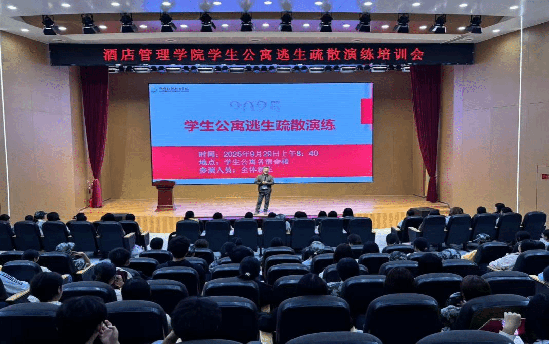 为确保新生公寓逃生疏散演练安全、高效推进,明确引导人员职责与操作规范,酒店管理学院于9月28日下午在敏行楼小礼堂组织召开学生公寓逃生疏散演练培训会,酒店管理学院党总支书记郭防出席培训好,为演练顺利开展提前“划重点、明方向”。