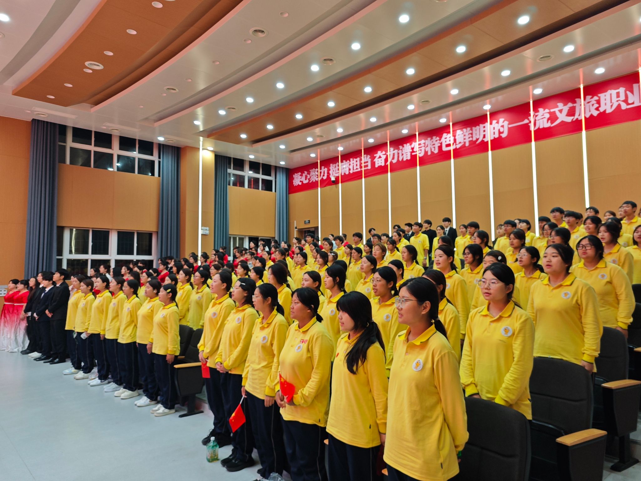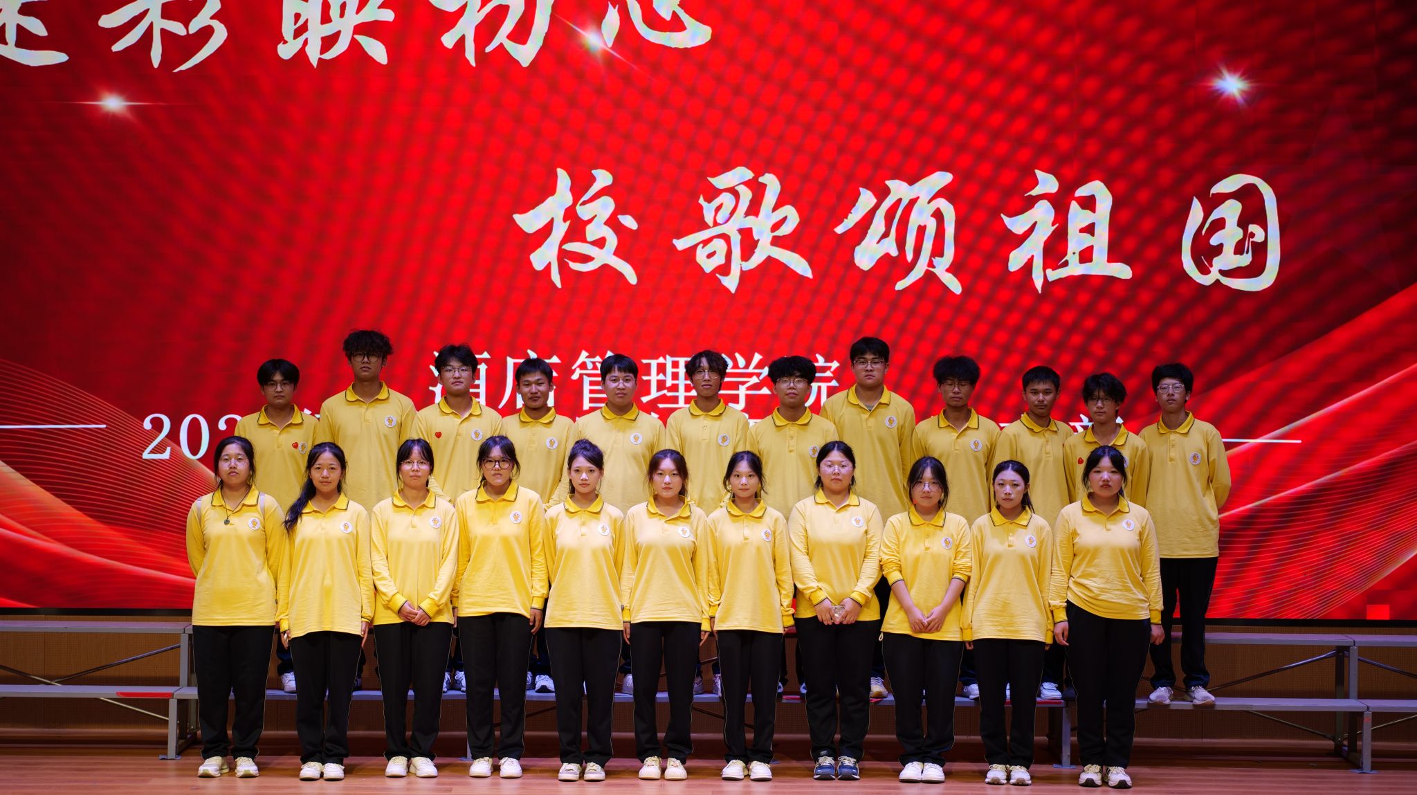 为丰富校园文化生活,展现新生风采,增强班级凝聚力,酒店管理学院于本周在小礼堂开展“迷彩映初心·校歌颂祖国”军训表彰暨合唱比赛。酒店管理学院团总支书记侯宁波、学工办主任孙孟珂及专职辅导员韩瑞新出席活动,与2025级新生代表共同见证这一热血时刻。
