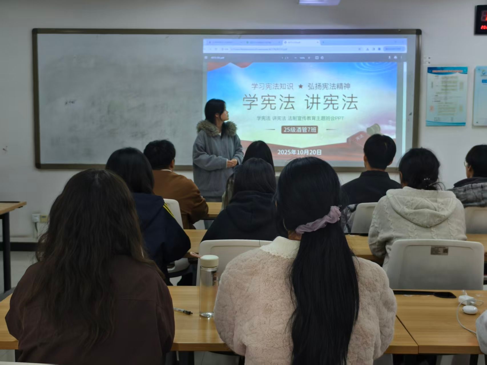 为深入贯彻落实宪法宣传教育要求,帮助学生筑牢法治思想根基,引导青年树立尊法守法意识,酒店管理学院于本周召开“宪法学习”主题班会。