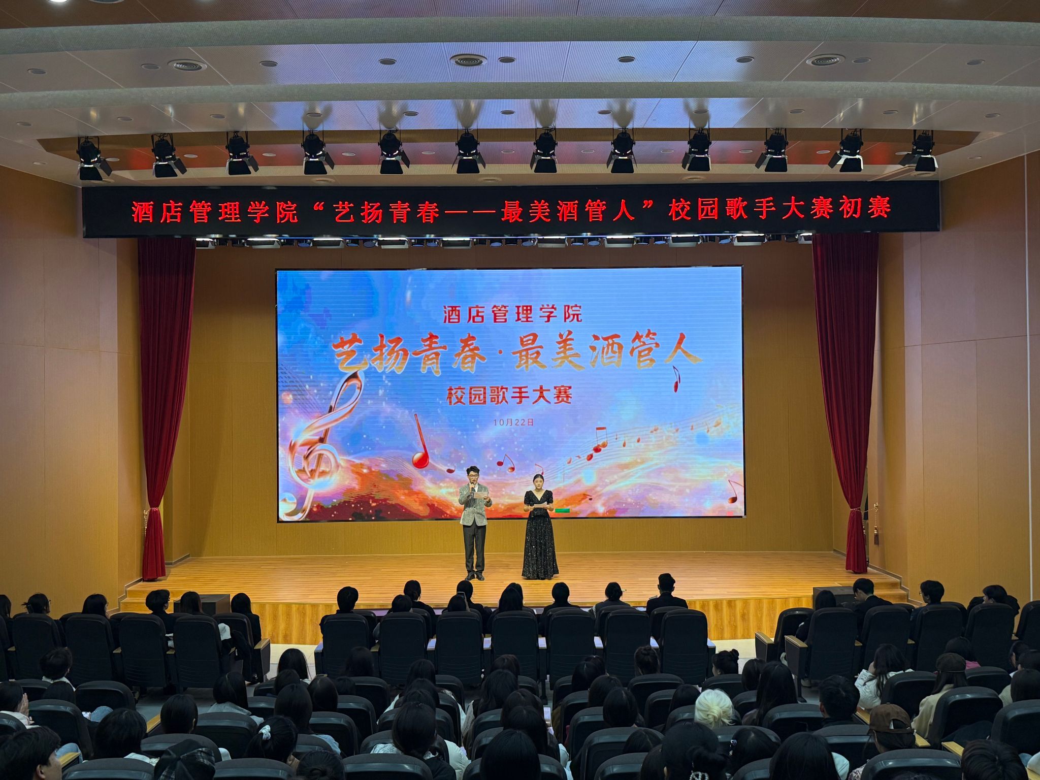为丰富校园文化生活,发掘学生音乐才华,展现我院学子青春风貌,酒店管理学院于10月21日在敏行楼小礼堂举办“艺扬青春——最美酒管人”校园歌手大赛初赛。