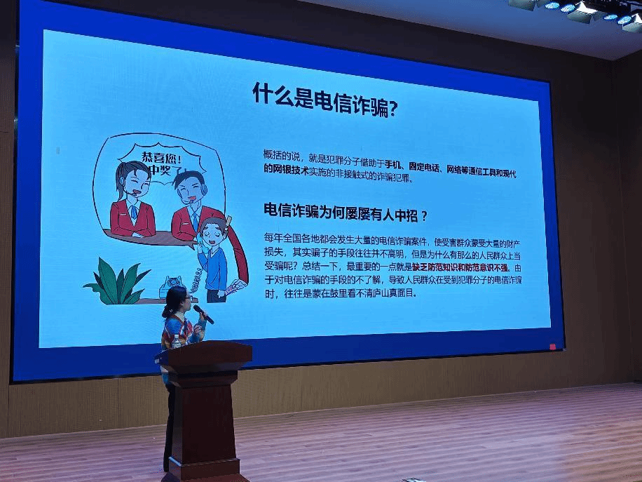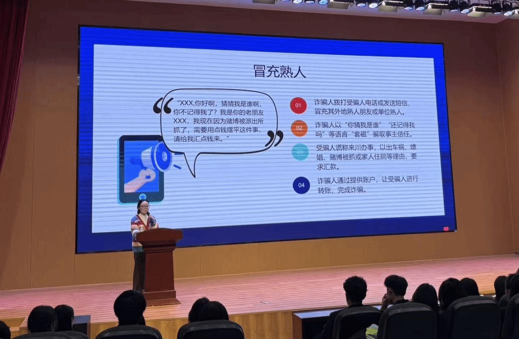 讲座中,赵苏楠老师围绕电信诈骗的定义、常见类型及防范方法展开讲解。她结合大学生生活场景,详细拆解冒充身份诈骗、网络购物诈骗等高频骗局,并针对每种骗局给出具体防范提示。同时,她重点强调“三不一要”原则——不透露个人信息、不轻信陌生信息、不随意转账,遇骗要及时报案,还通过反诈口诀帮助新生快速记忆核心要点,让反诈知识更易理解、好记。