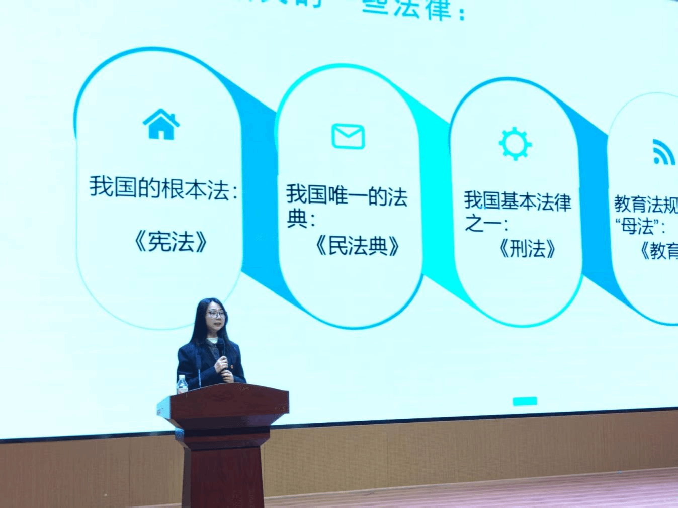 讲座聚焦学生日常行为规范,从法律、校园管理、学业三方面层层递进。法律层面,张玙解读了《宪法》、《民法典》等重要法规;校园管理方面,她详细说明了宿舍违禁电器、夜不归宿等违纪处分标准;学业层面,她强调了旷课等违纪情况的处分要求。