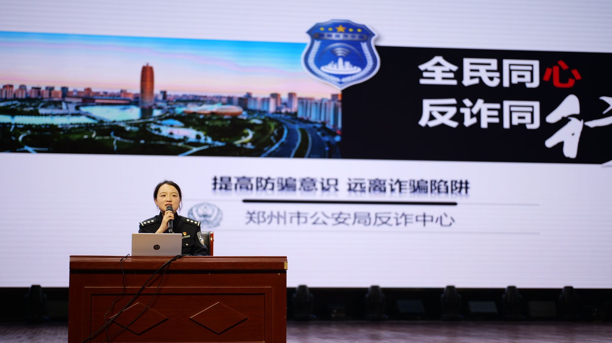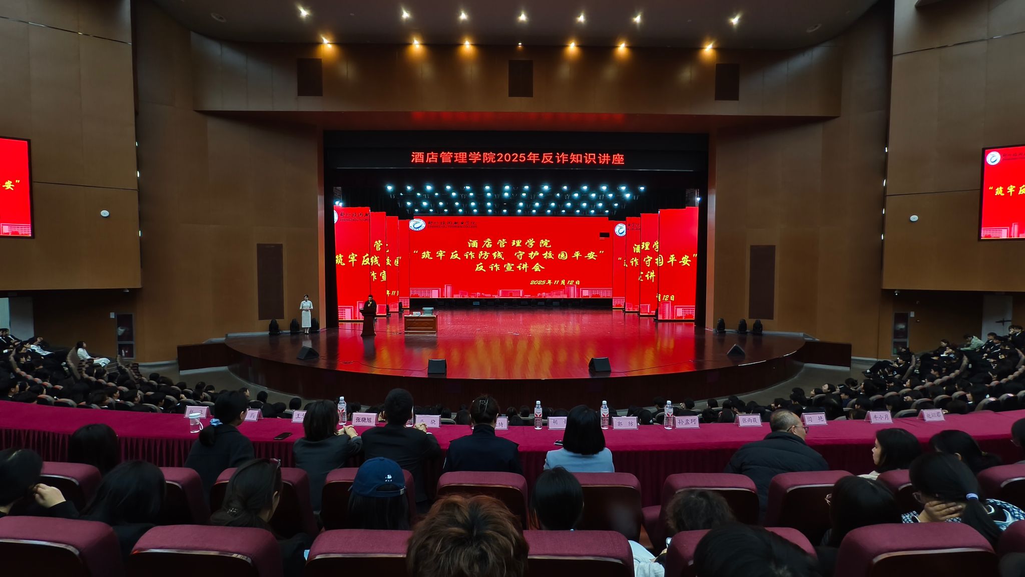 为切实提升大学生防范电信网络诈骗的意识和能力,筑牢校园安全防线,11月13日,酒店管理学院在艺术中心举办了“全民同心,反诈同行”大学生防诈骗宣传讲座。活动邀请酒店管理学院党总支书记郭防、招商银行郑州分行营业部总经理胡静、郑州市公安局郑东新区分局如意湖派出所副所长付兰绮、招商银行郑州分行九如路支行行长马骁以及学院教师代表出席,共同为同学们带来一堂生动而深刻的防诈知识讲座。