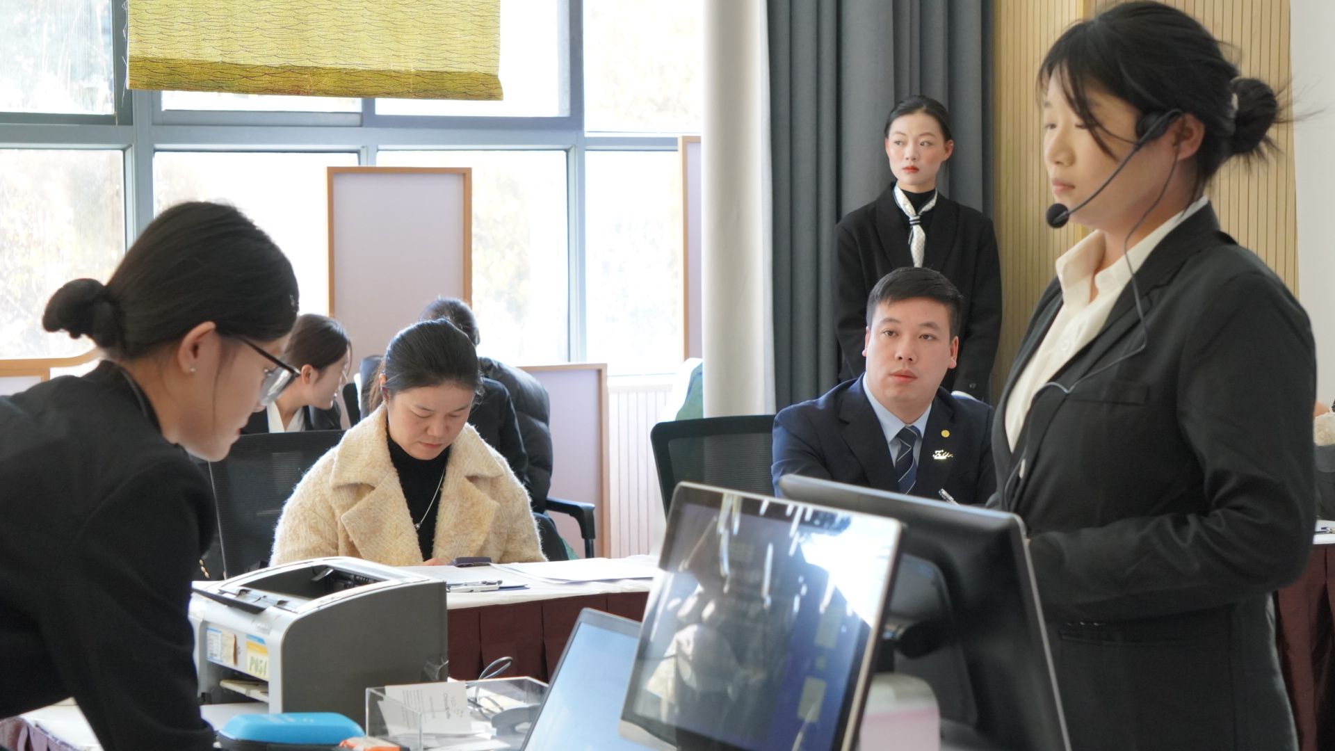 比赛现场,气氛紧张而热烈。来酒店管理学院的16名参赛选手同台竞技,围绕前台预订、入住登记等核心工作流程展开激烈角逐。选手们需要在一个高度模拟真实酒店前厅的环境下,面对由专业教师扮演的“客人”,完成一系列标准化与个性化相结合的服务任务。