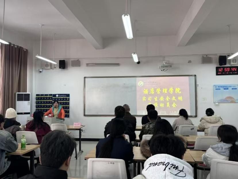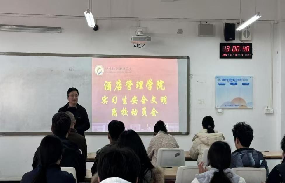为了规范实习生离校流程,营造文明、安全、和谐的离校氛围,确保学生顺利过渡至实习岗位,酒店管理学院于11月19日组织召开实习生文明离校动员会。学院党总支书记郭防出席会,实议习离校班级辅导员、生活委员和宿舍长参会。