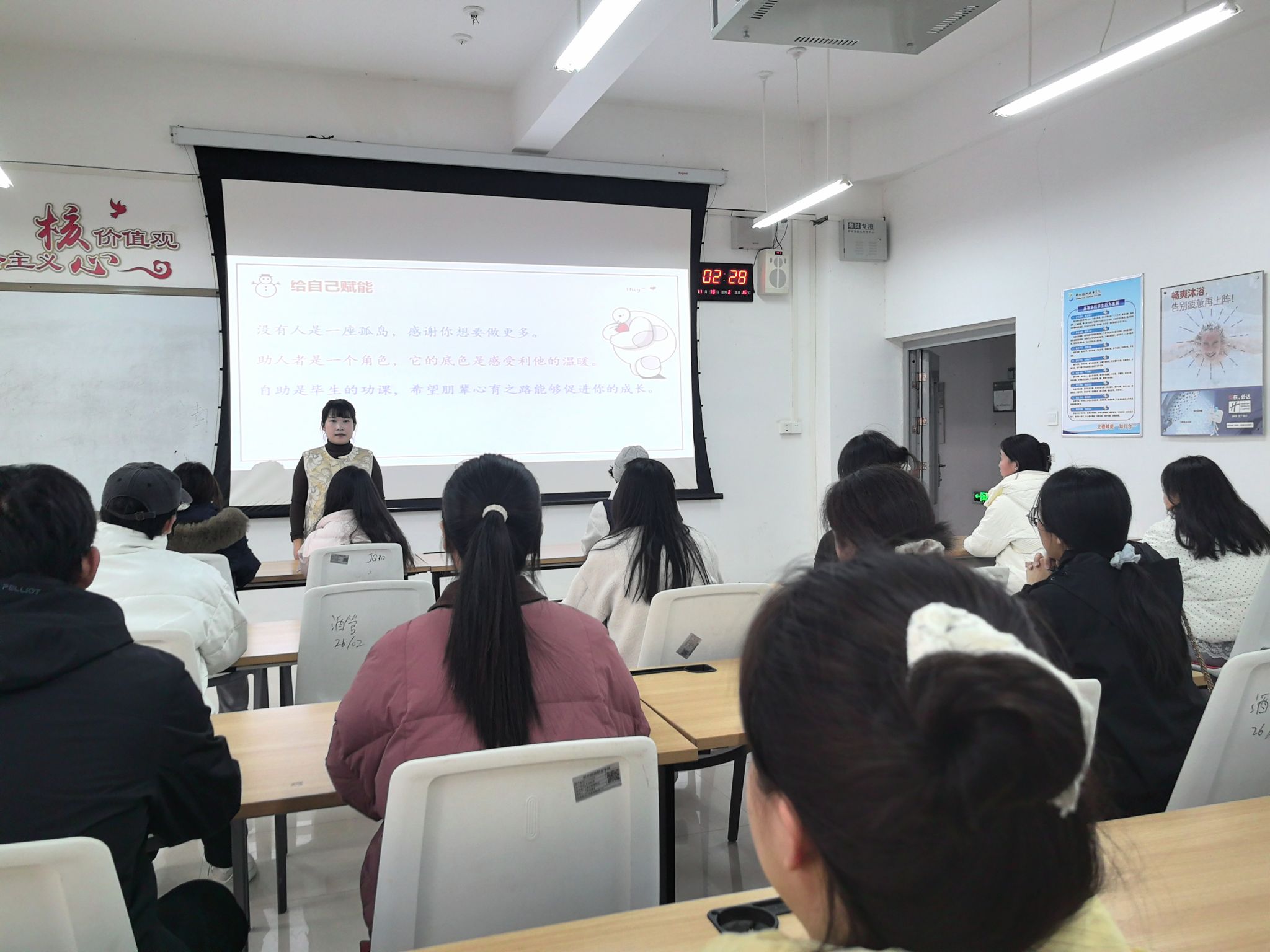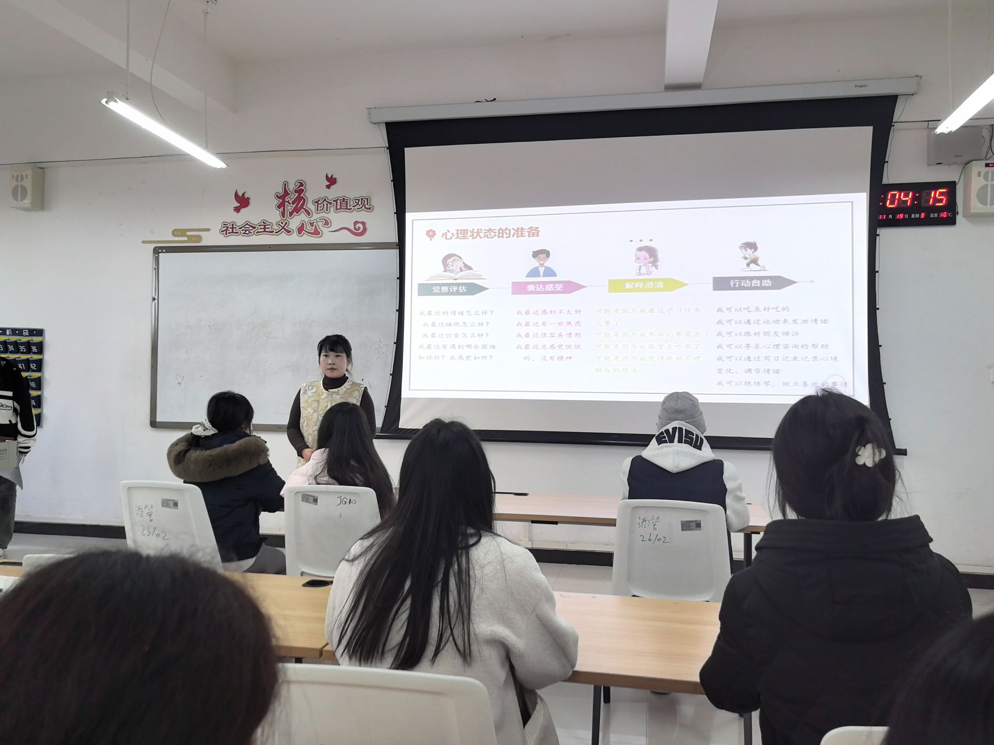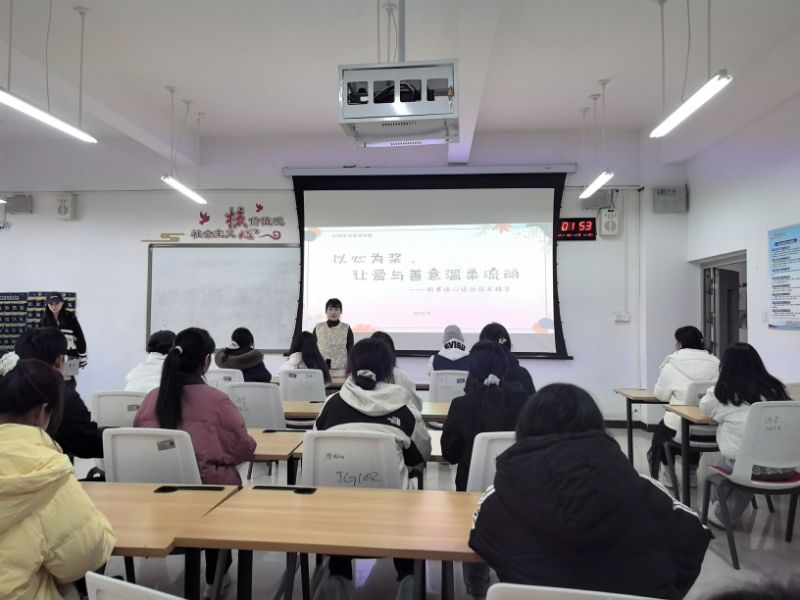 在培训中,闫艳老师围绕“谈心谈话前的自我准备”、“谈话对象与地点的选择”、“主要方法与技术”以及“自我关护”四个方面展开了详细讲解。她强调,心理委员在助人之前应先做好自我状态调整,通过情绪觉察、表达感受和行动自助等方式稳定自身心理状态。