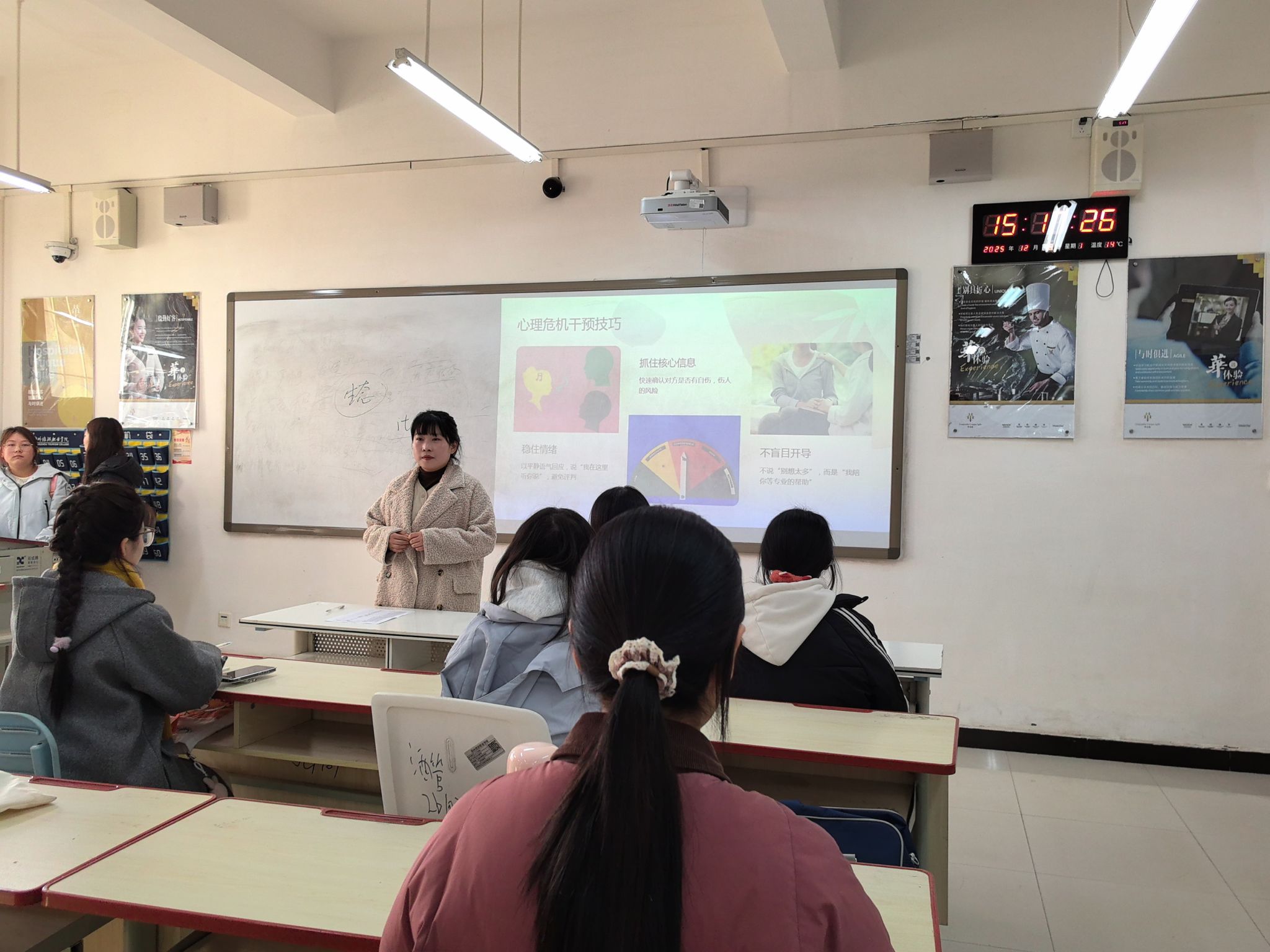 本次培训聚焦心理委员核心工作职责与能力提升,内容丰富务实、针对性强。培训中闫艳系统讲解了常见心理问题识别方法,从情绪持续异常、行为突发转变、生理病因躯体反应三大维度,帮助心理委员培训精准捕捉心理困扰信号;细致传授心理危机干预技巧,强调以平静共情态度回应危机、快速排查自伤伤人风险、科学引导寻求专业帮助的关键要点,规避无效开导误区;同时分享高效沟通与倾听方法,通过专注陪伴、复述确认、耐心追问等实用技巧,助力学生搭建良好心灵沟通桥梁。