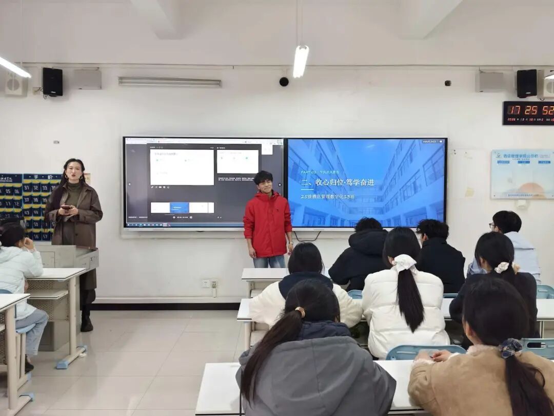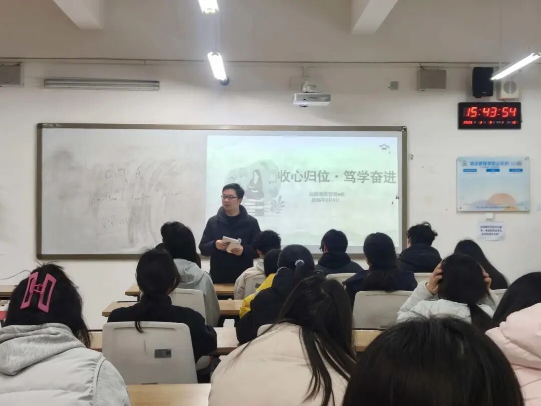 为进一步加强班级学风班风建设,引导同学们快速调整状态、收心归位,以良好精神面貌投入新学期学习生活,近日,酒店管理学院组织开展 “收心归位・笃学奋进” 学风班风教育主题班会。班会围绕纪律规范、学习态度、班级建设等核心内容展开,帮助同学们明确新学期目标,营造勤学善思、团结向上的班级氛围。