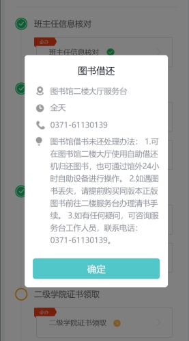 (2)图书借还:如该环节显示黄色图标,表示该生有欠书未还,需完成还书方可办理离校。