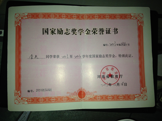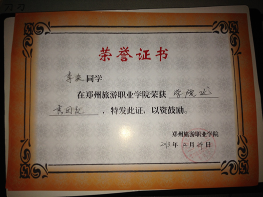 我学习一直勤奋刻苦,在老师辛苦栽培下也有了自己的刻苦专研,拿到了国家励志奖学金,这就是我成绩的见证。不仅掌握了应该掌握的专业技能和专业知识,在空闲时间修了我院旅游管理系的一些课程并且通过了导游资格考试取得了导游资格证书,还充分利用双休日时间学习驾驶技能在2013年年底通过了驾驶员技能考试所有科目拿到了驾驶证。